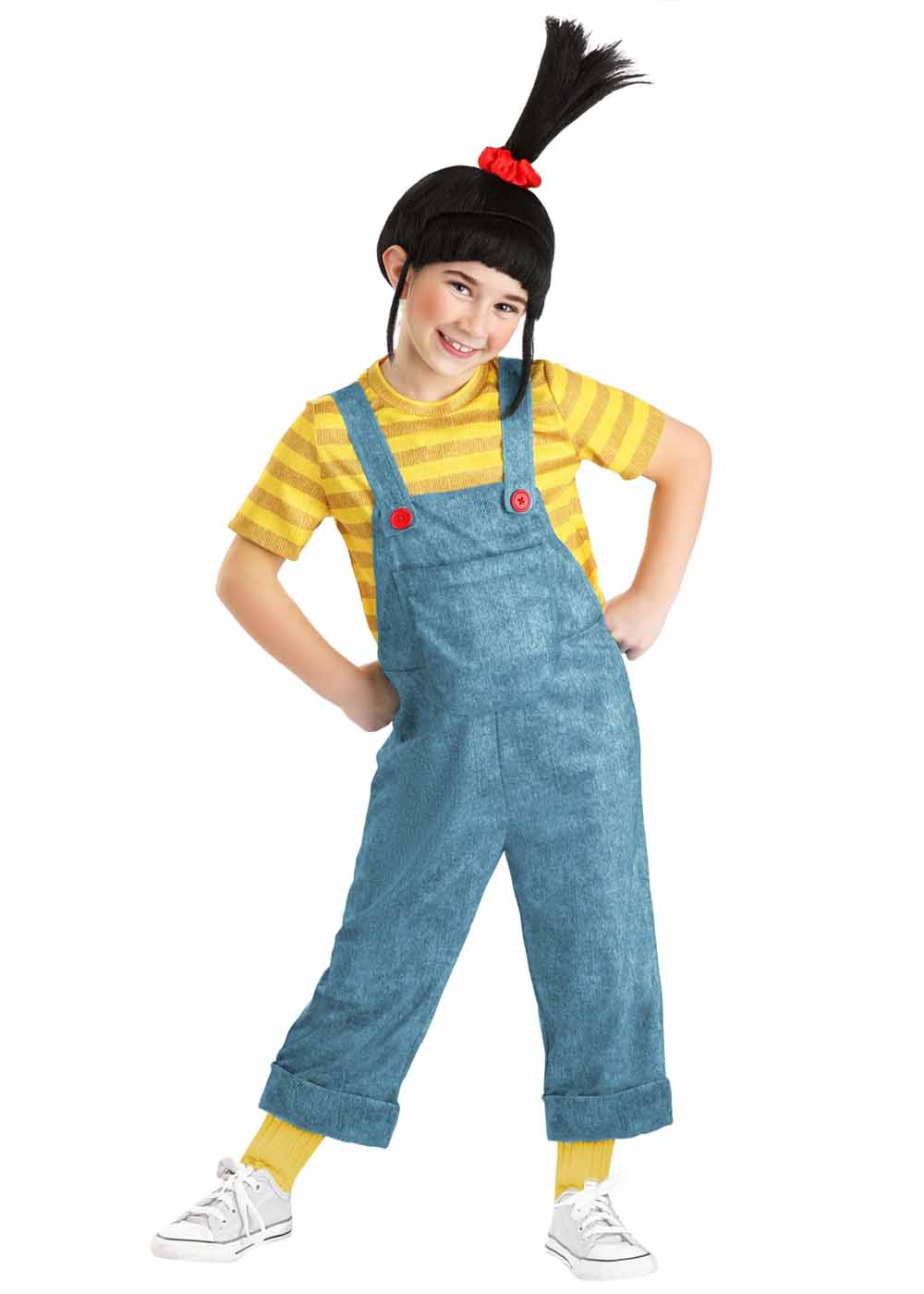 Агнес костюм представляет собой яркий и милый наряд, вдохновленный любимым персонажем. Жёлтая кофта с белыми полосками придаёт образу солнечное и весёлое настроение, идеально подходящее для веселых приключений. Синий комбинезон с двумя красными пуговками добавляет нотку озорства, создавая эффектный и запоминающийся вид. Костюм не только сделает вас частью волшебного мира Миньонов, но и подарит радость и улыбки всем вокруг.