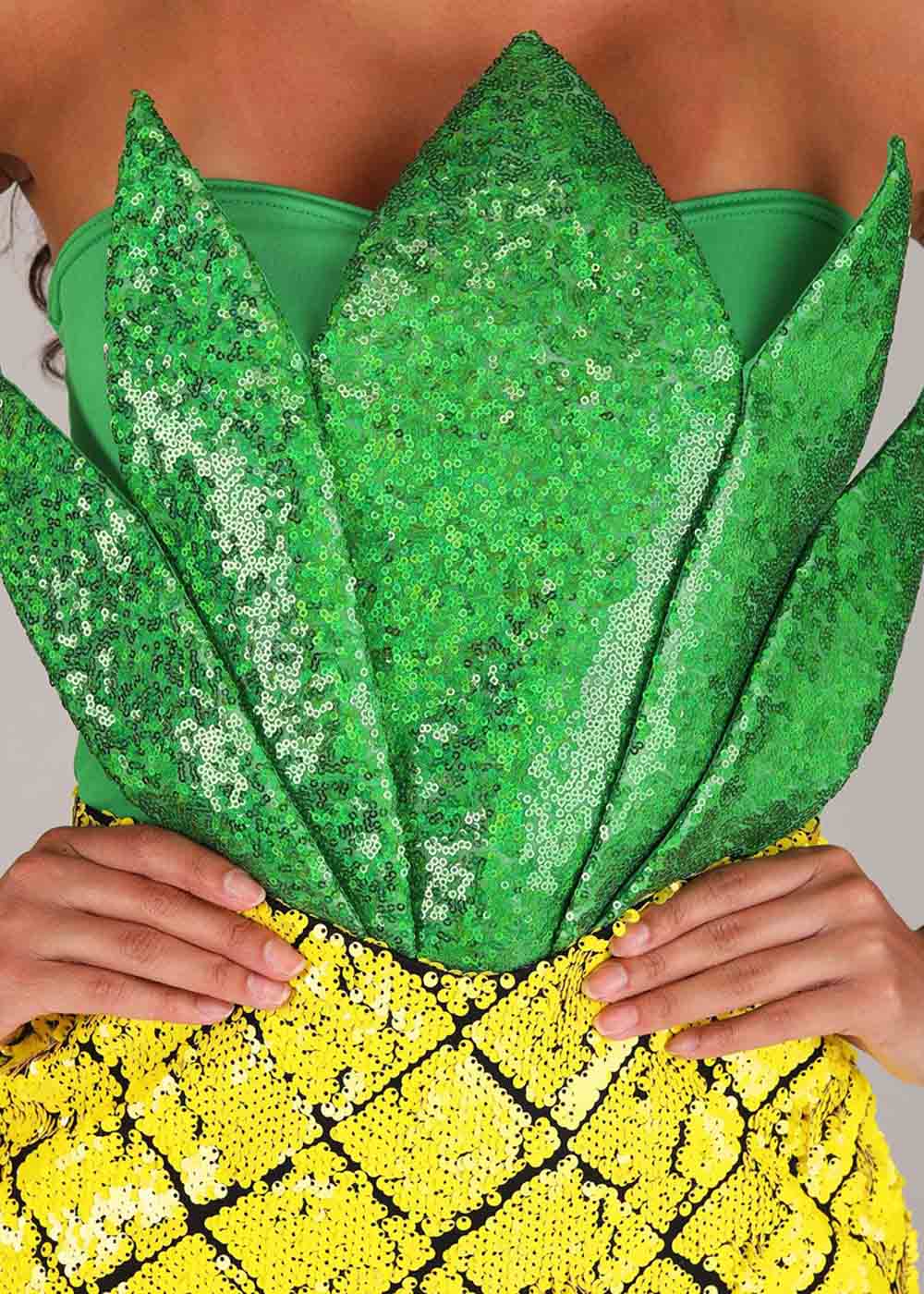 Ананас костюм — яркий и стильный выбор для тех, кто ценит оригинальные образы. Платье обеспечивает надежную посадку благодаря застежке молнии по центру спины, а силиконовая эластичная лента обеспечивает идеальное прилегание к груди. Верхняя часть платья украшена зелеными листьями на пенопластовой подкладке, декорированными эластичными блестками, придавая образу особую эффектность. Нижняя часть платья впечатляет яркими желтыми и черными ромбовидными пайетками, которые воссоздают текстуру ананаса и добавляют визуальный интерес.