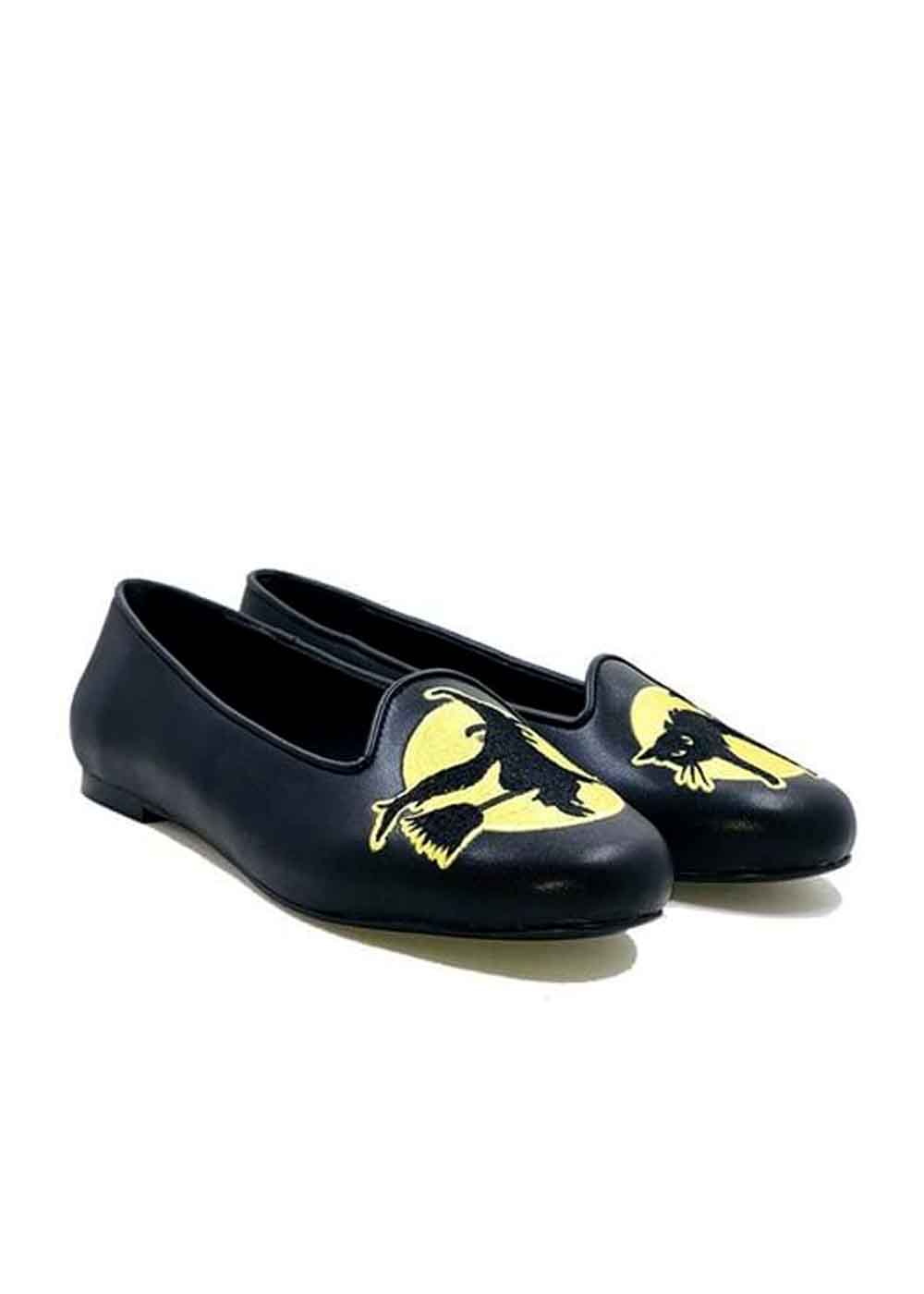 Балетки на Хэллоуин привносят в ваш образ неповторимый колорит. Изготовленные из прочной искусственной кожи. Яркие и запоминающиеся вышитые изображения ведьмы на метле и кота создают атмосферу таинственности, идеально подходящую для праздничного вечера.