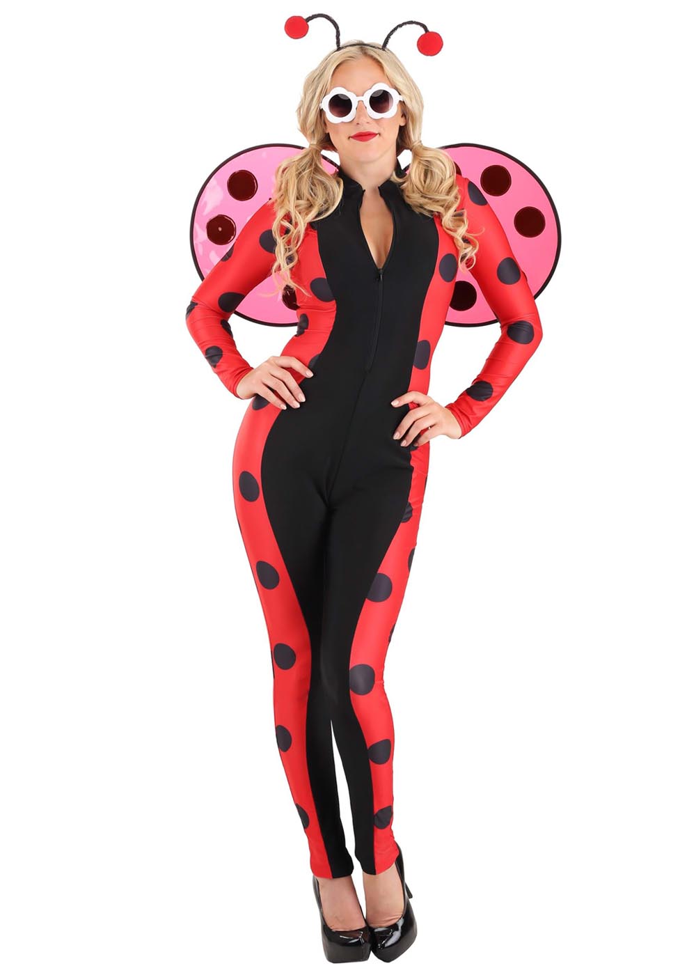 Костюм божьей коровки включает комбинезон с передней молнией, прозрачные крылья из с эластичными лямками через плечи и проволокой по краям, а также обтянутую тканью повязку на голову с антеннами с помпонами.