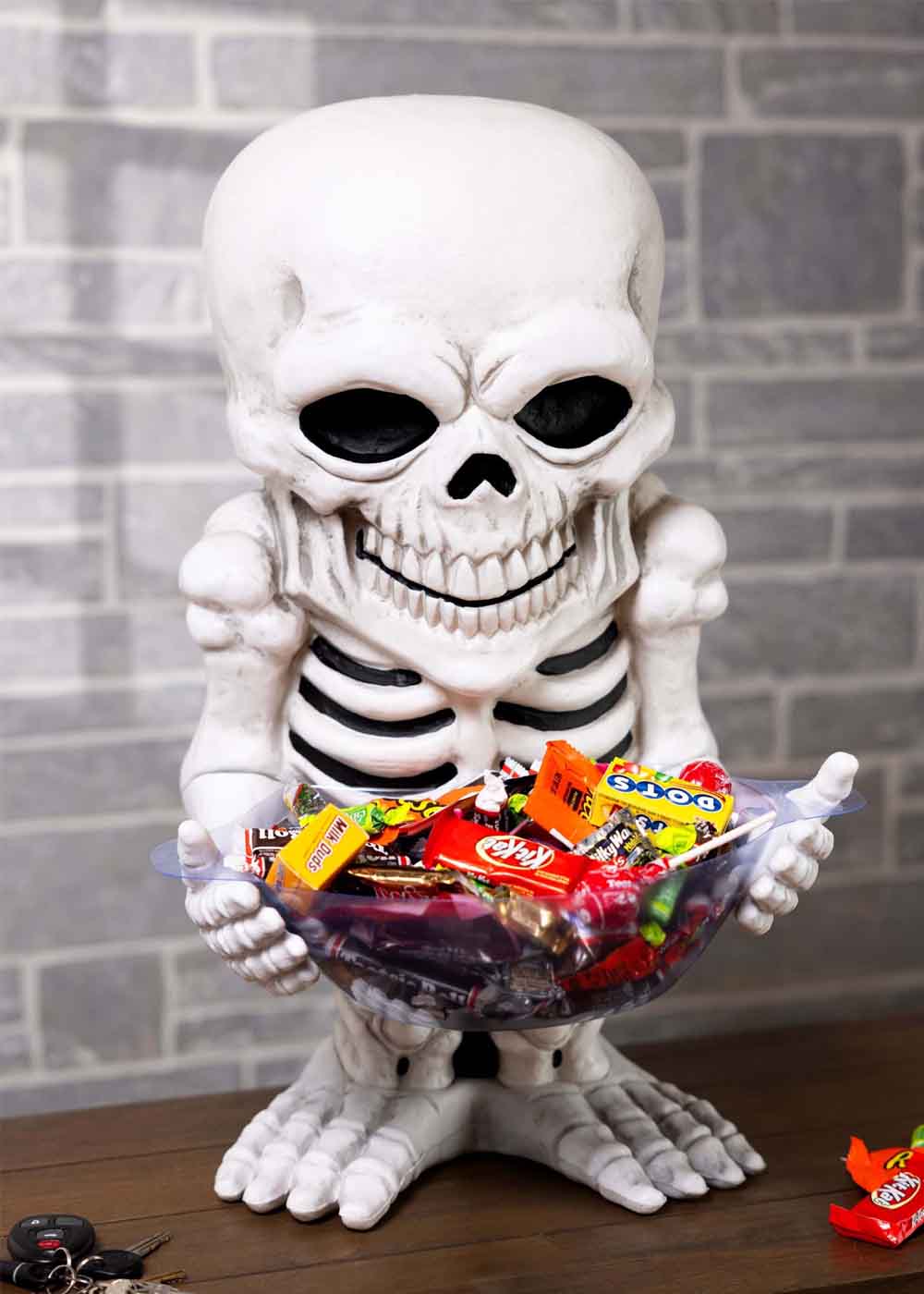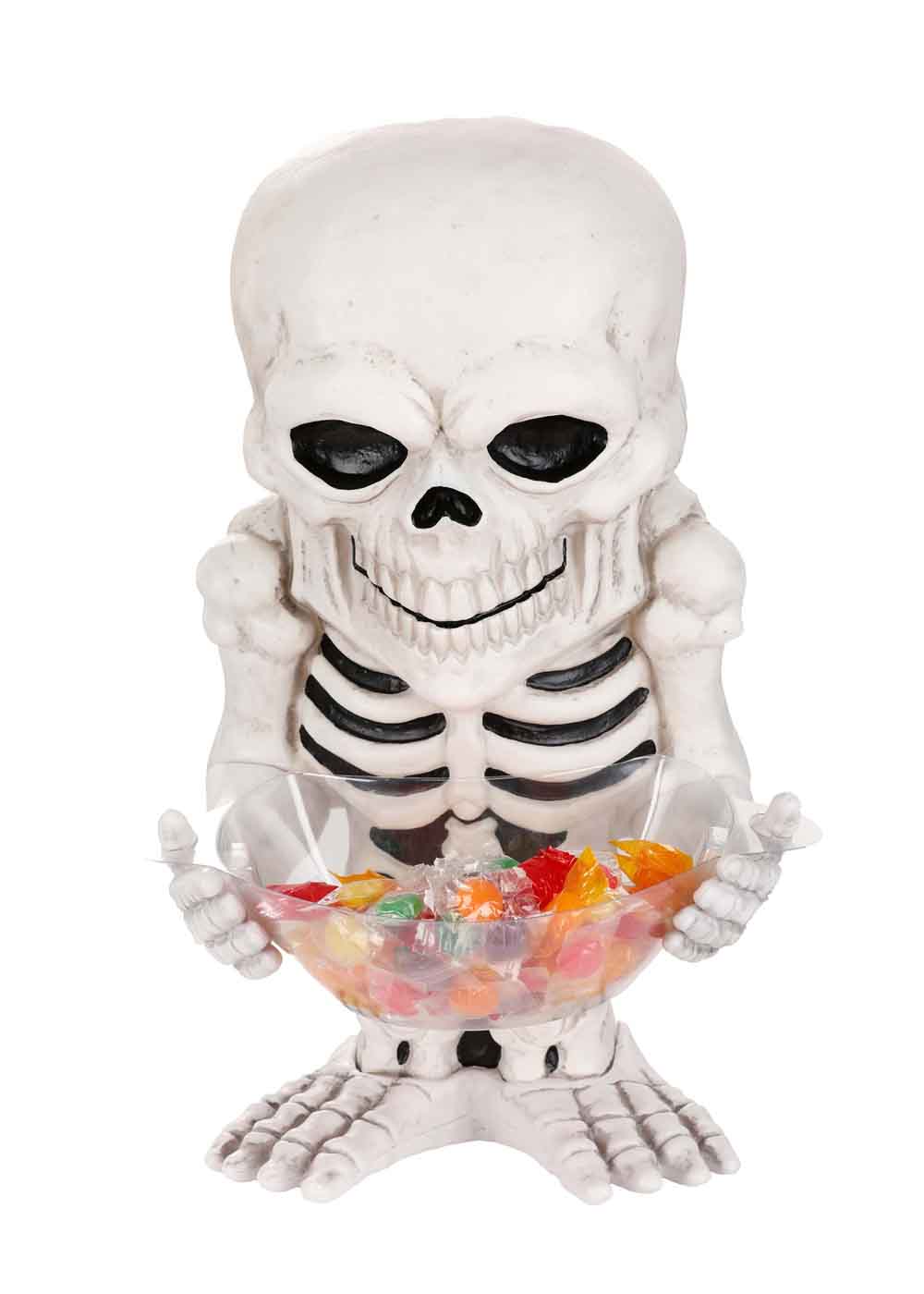 Держатель для конфет в стиле скелета - идеальное украшение для вечеринки на Хэллоуин или тематического мероприятия. Размеры держателя - высота 53 см, ширина 28 см и глубина 20 см. Держатель из формованного пластика. Скелет, ручки и чаша изготовлены из прочного материала. Для сборки нужно вставить руки в пазы и повернуть до щелчка. Чаша опирается на руки фигурки и имеет петли для надевания, обеспечивая устойчивость.