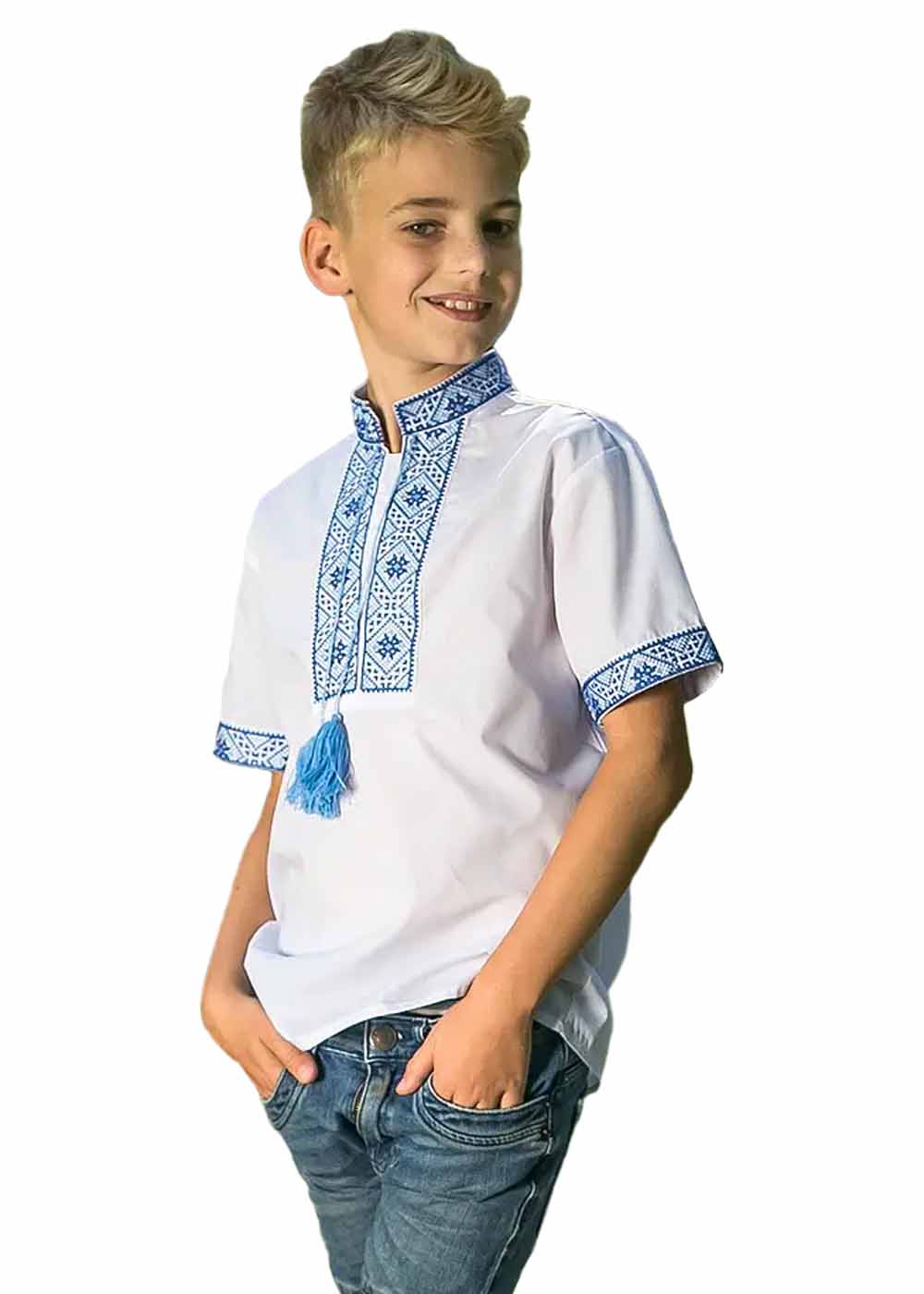 Детская вышитая футболка Любомир – изысканное сочетание традиций и стиля. Белая основа украшена голубым орнаментом, который придает футболке особый шарм. Идеальный выбор для праздников и повседневного использования.