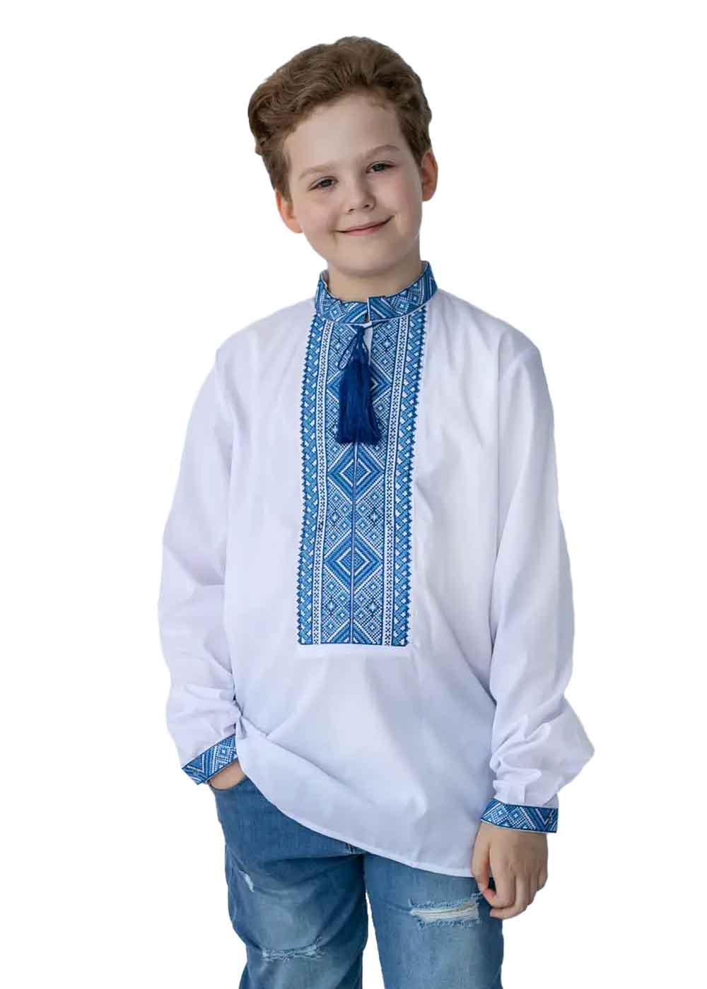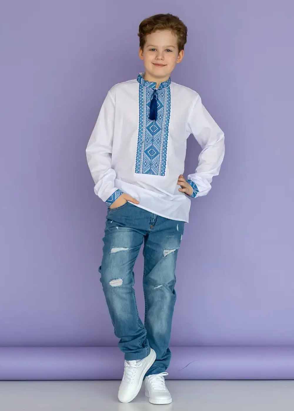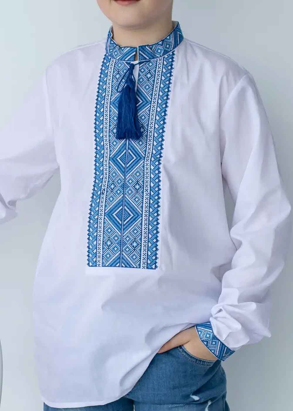 Детская вышиванка Грицько белая - элегантная белая вышиванка, украшенная изысканной голубой вышивкой спереди. Завязочки на груди, выполненные в насыщенном синем цвете, добавляют яркий акцент и позволяют идеально подогнать одежду по фигуре. Вышиванка сочетает традиционную красоту с современным комфортом, делая отличным выбором для любого особого случая.