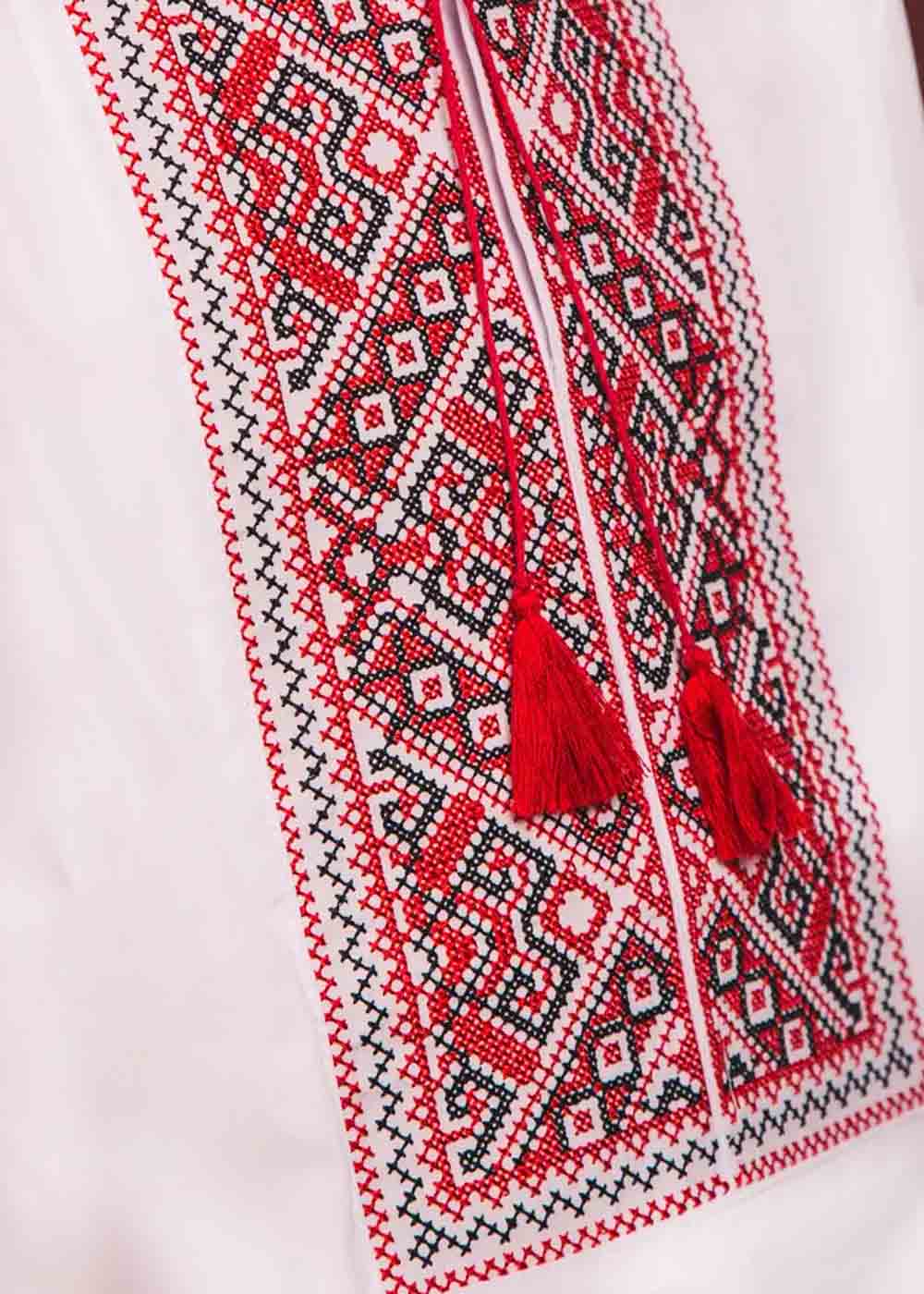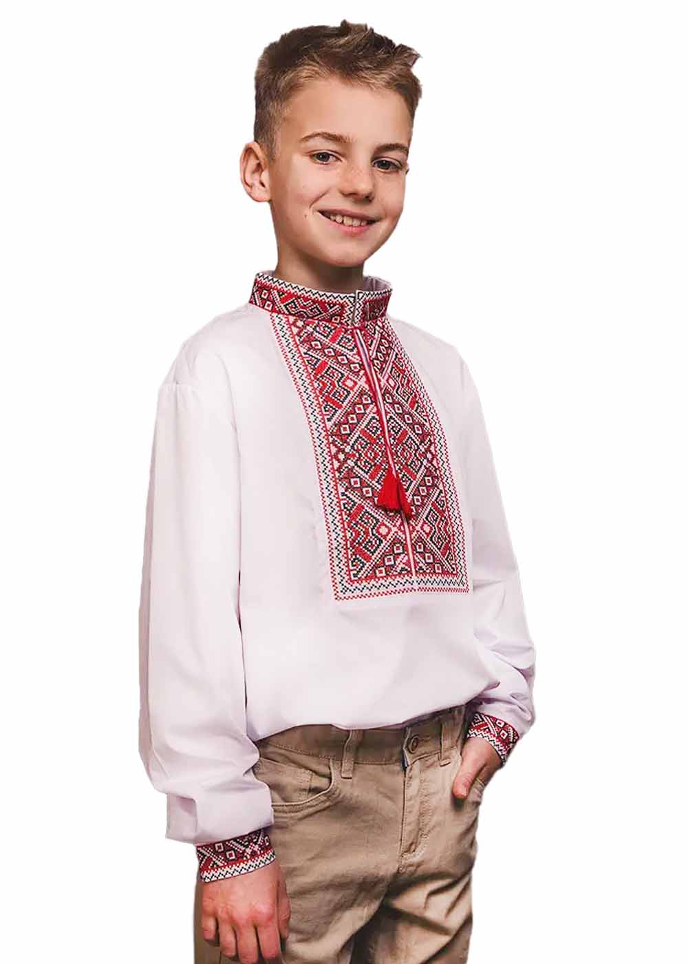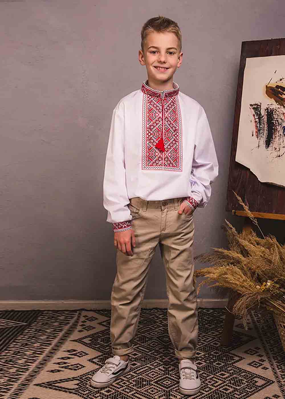 Детская вышиванка Отаман белая – стильная и удобная одежда для вашего ребенка. Белая ткань украшена ярким красным орнаментом, придающим вышиванке традиционный и нарядный вид. Идеальный выбор для праздников и повседневной носки, подчеркивающий национальный колорит.
