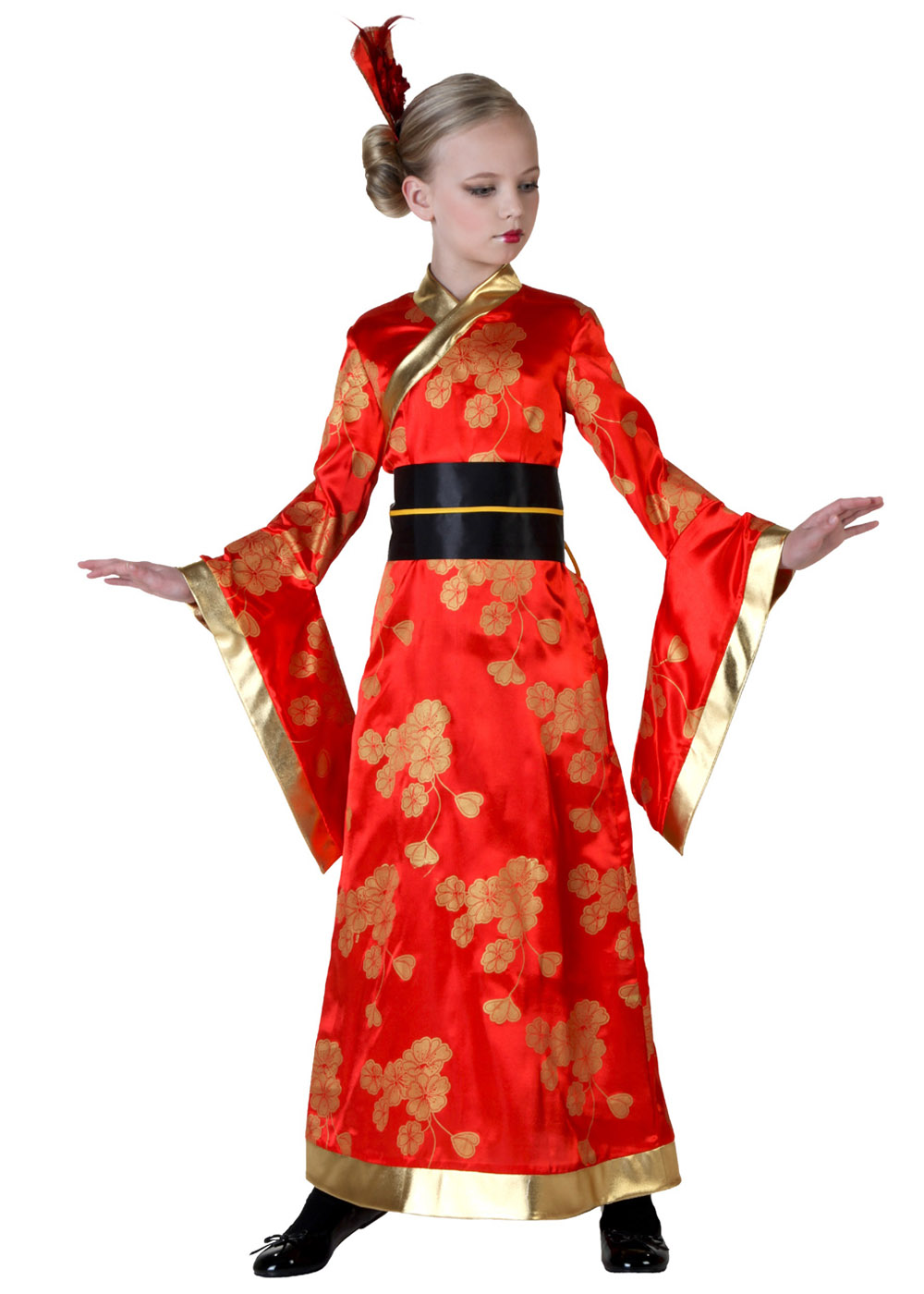 Детское кимоно включает в себя красное атласное платье с задней молнией и золотым цветочным узором. У подола, выреза и манжет висят полосы жёлтого поплина. Чёрный атласный оби закрывается на липучке и завязывается золотым шнурком. Украшение для волос - это атласный цветок и прямоугольник из ткани платья на металлическом зажиме-крокодиле. Пожалуйста, обратите внимание, что отделка выполнена жёлтым цветом, а не золотым, как показано на фото.