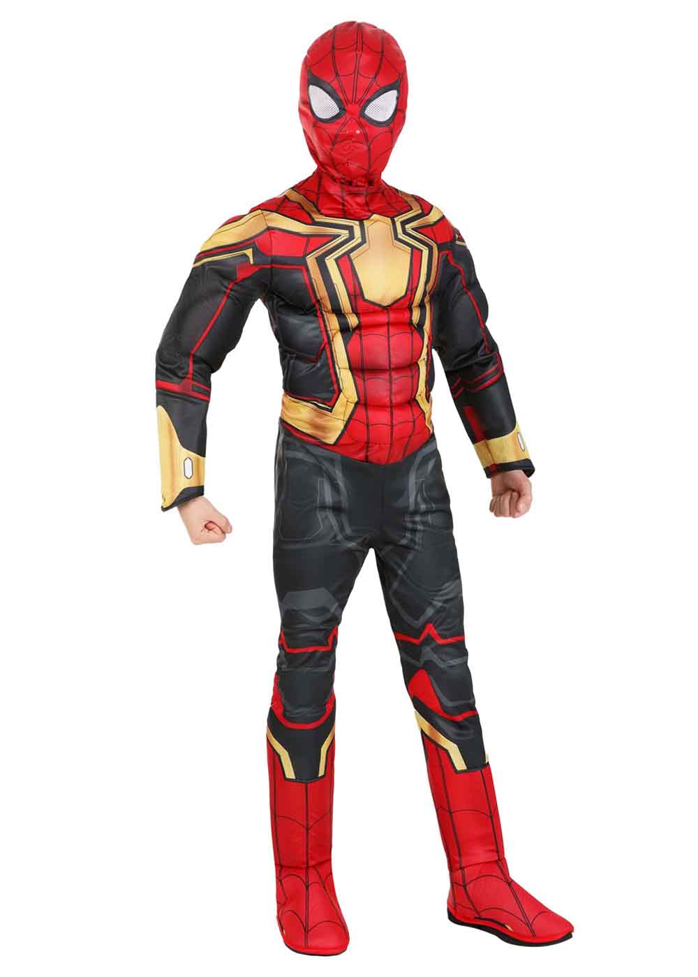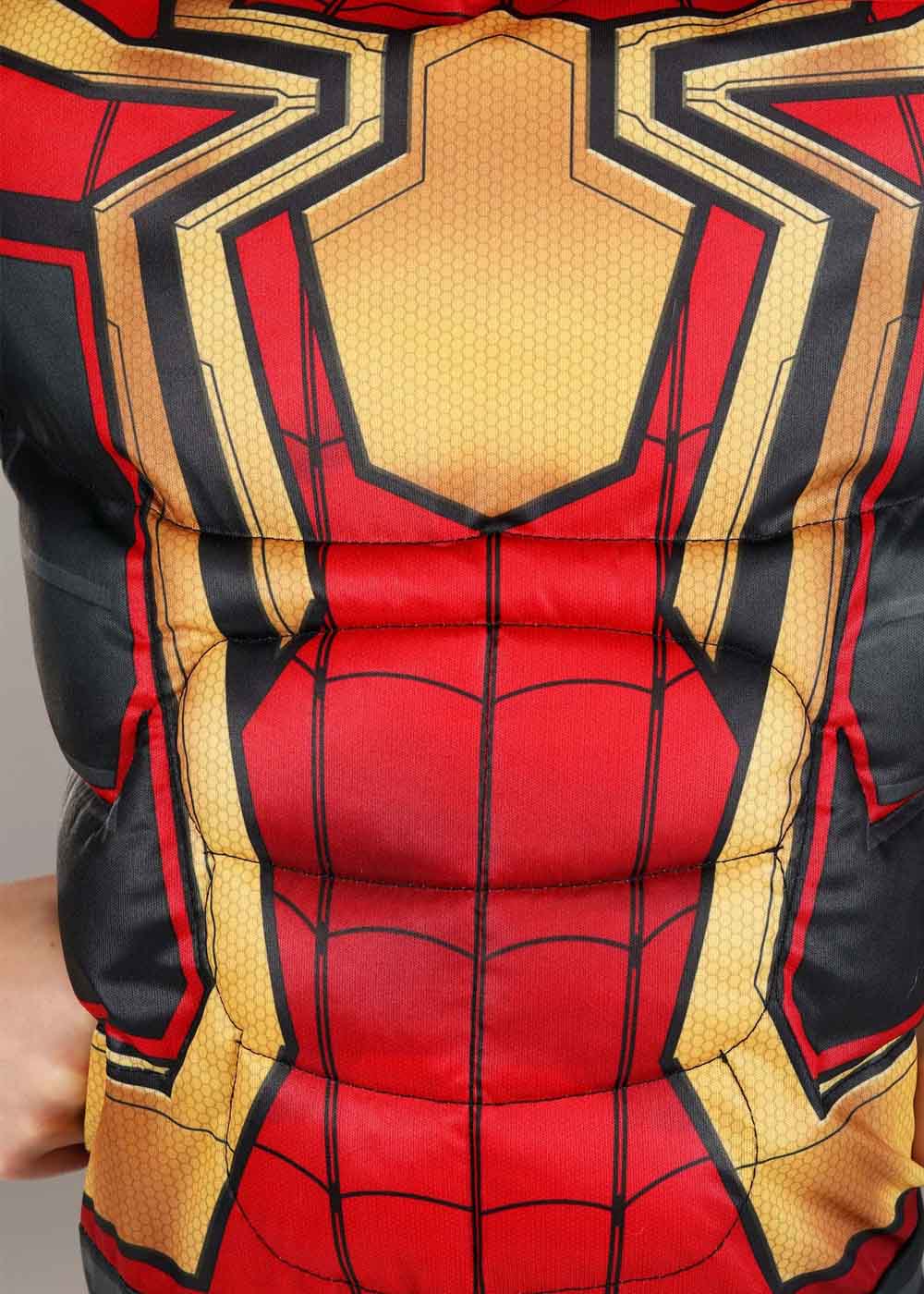 Интегрированный костюм "Человека-паука" представляет собой комбинезон с застежками на липучках по центру спины. Наполнитель в области груди и плеч создает мускулистый вид. На груди нанесен принт с паутиной и пауком. Резинки на накладках для обуви обеспечивают их фиксацию под стопами. Маска оснащена сетчатыми отверстиями для глаз.
