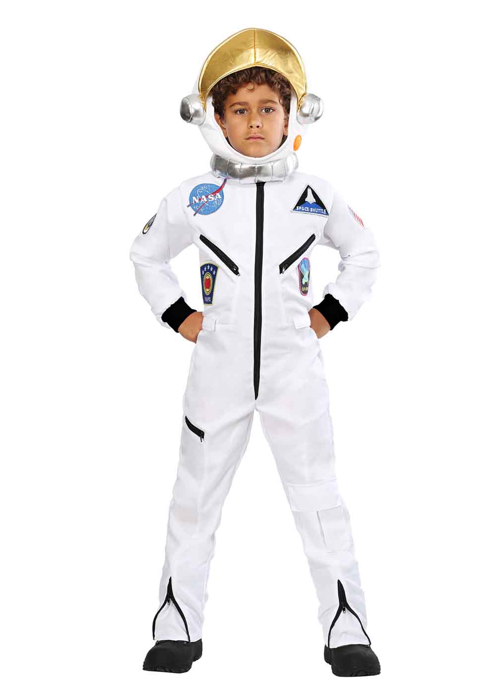 Детский костюм космонавта оснащен молнией для удобства. Горловина и манжеты рукавов выполнены из ребристого трикотажа. Манжеты брюк имеют вертикальные молнии для расширения над ботинками. Три накладных кармана с декоративными молниями, функциональный карман на левой ноге брюк. Обратите внимание, что скафандр можно купить отдельно.