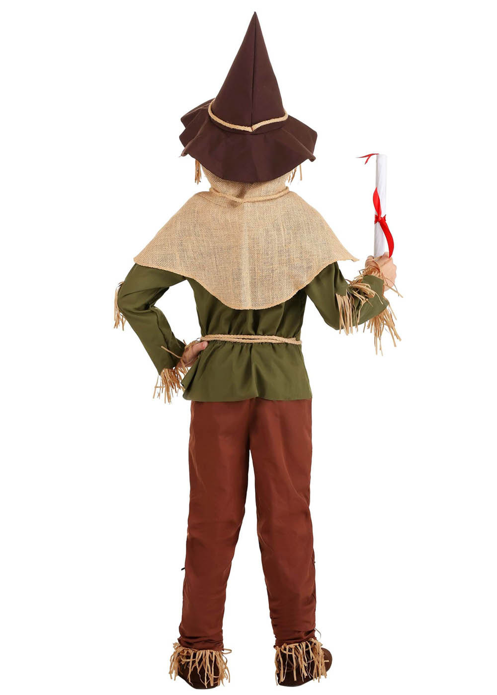 Этот костюм Пугало из "Волшебника страны Оз" привнесет в ваш образ доброту и теплоту. Рубашка, брюки и шляпа выполнены из высококачественного полиэстера, а капюшон из льна. Рубашка закрывается на липучку на задней части шеи, а веревочный пояс пришит к рубашке на талии. Манжеты рукавов украшены обрубками из рафии, создавая вид "соломы". Брюки имеют эластичный пояс и аппликации в виде заплаток. Головной убор из мешковины имеет мягкую подкладку из ткани и эластичную ленту для шеи, а коническая шляпа украшена веревочной лентой. Свиток представлен в виде картонного тюбика, завернутого в бумагу и завязанного красной лентой, чтобы завершить ваш наряд Пугала.