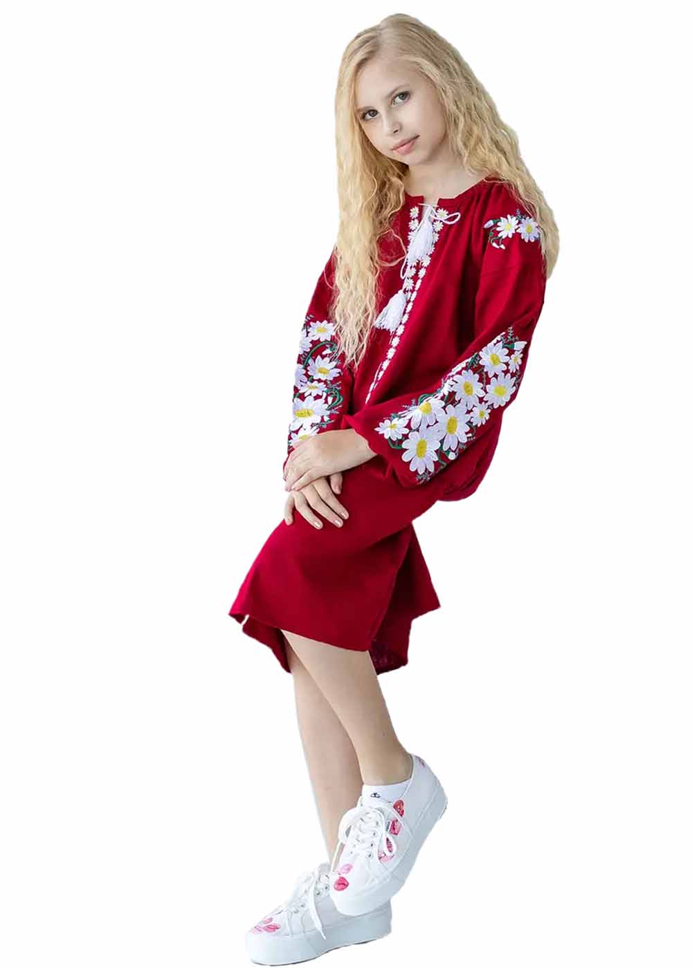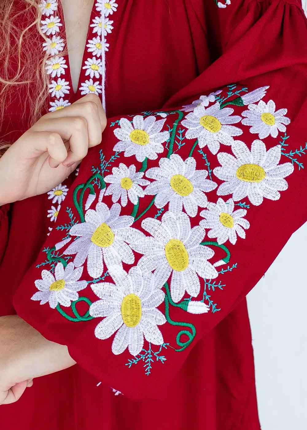Детское вышитое платье Дияна — красное платье с изысканной вышивкой ромашек. Каждая вышитая ромашка словно маленькое солнце, приносящее тепло и радость. Наряд добавит изящества и весенней свежести в гардероб каждой модницы.
