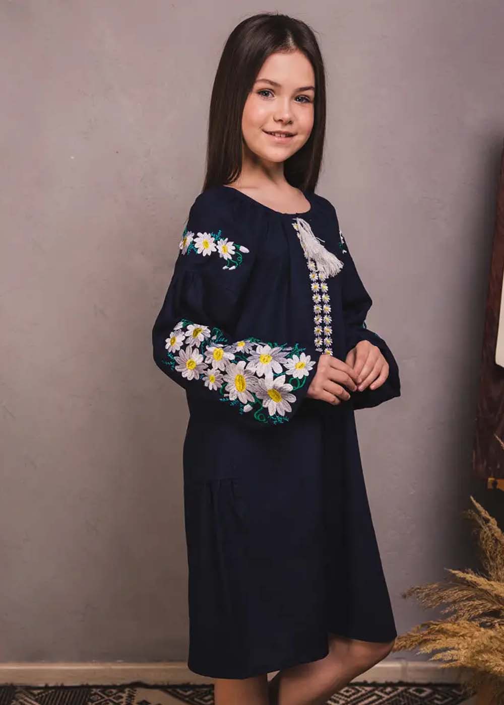 Детское вышитое платье Квитень — темно-синее платье с изящной вышивкой ромашек. Платье напоминает о вечерних прогулках в теплый весенний вечер. Наряд придаст изысканность и шарм, добавляя в образ нотку загадочности и красоты.