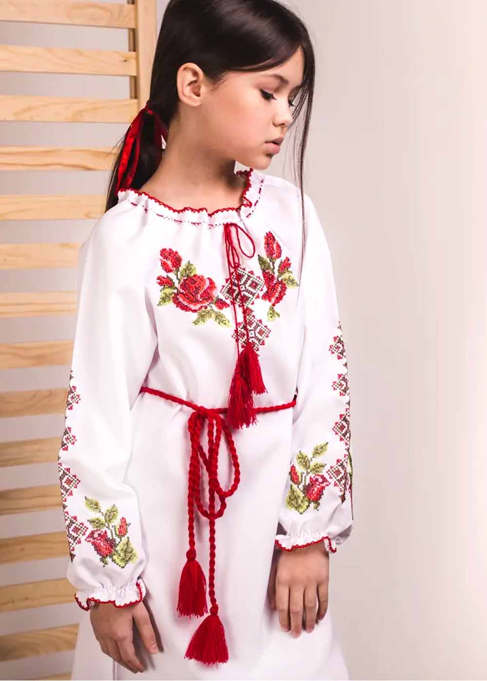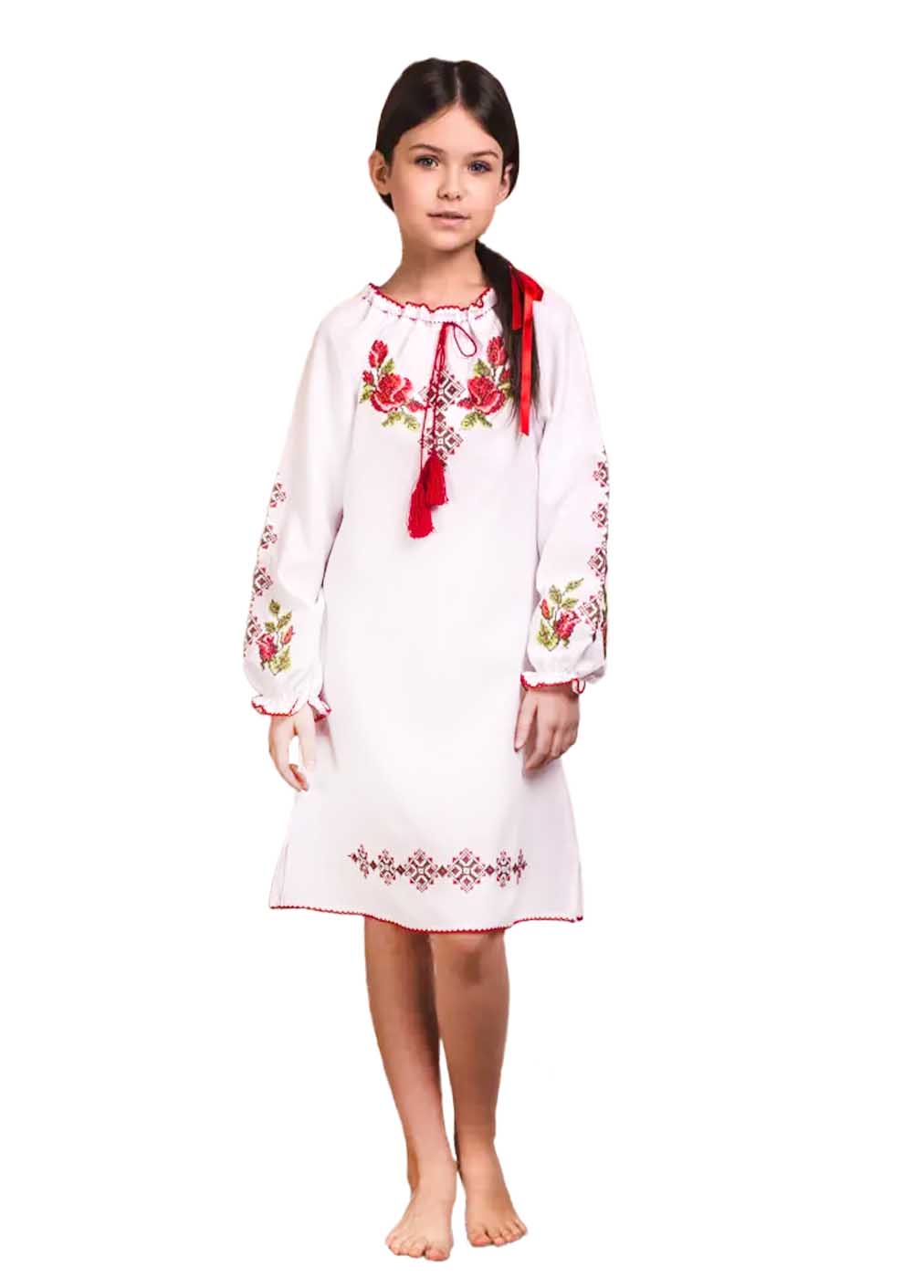 Детское вышитое платье Розочка — белое чудо с изящной вышивкой на груди и рукавах, дополненное красным тонким поясом. Ткань нежно обвивает фигуру, а яркая вышивка придает наряду особый шарм и неповторимость. Платье идеально подойдет для торжественных моментов и повседневной носки.