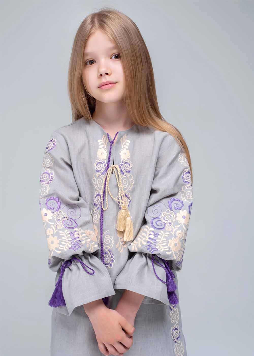 Детское вышитое платье представлено в сером цвете и пошито из натуральной льняной ткани. Предлагается в нескольких размерах. Платье вышиванка прямого кроя декорировано нежным цветочным узором. Комплект дополняет пояс. Машинная вышивка выполнена в технике “гладь”.