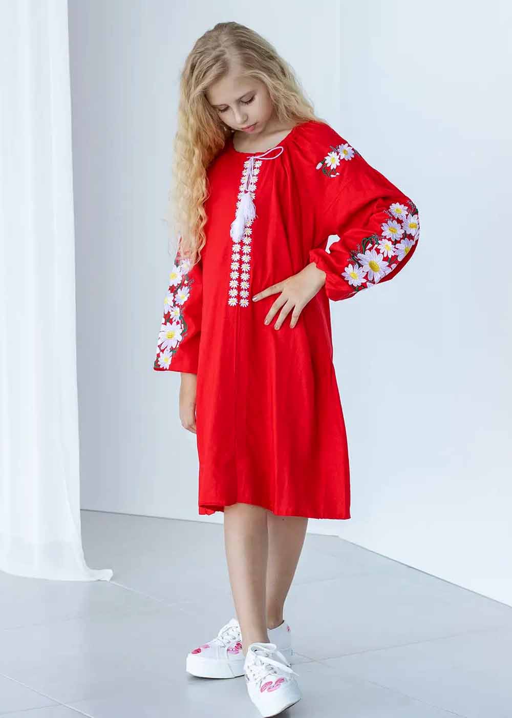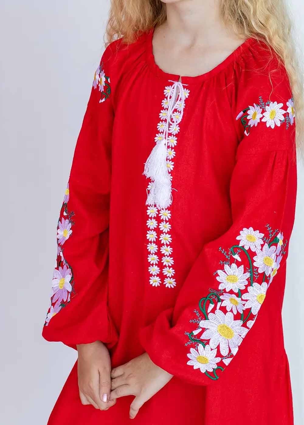 Детское вышитое платье Травень — красное платье с изысканной вышивкой ромашек. Платье словно украшение, в котором каждый цветок напоминает о теплых весенних днях. Наряд добавит ярких красок в гардероб и подарит радость и удовольствие.