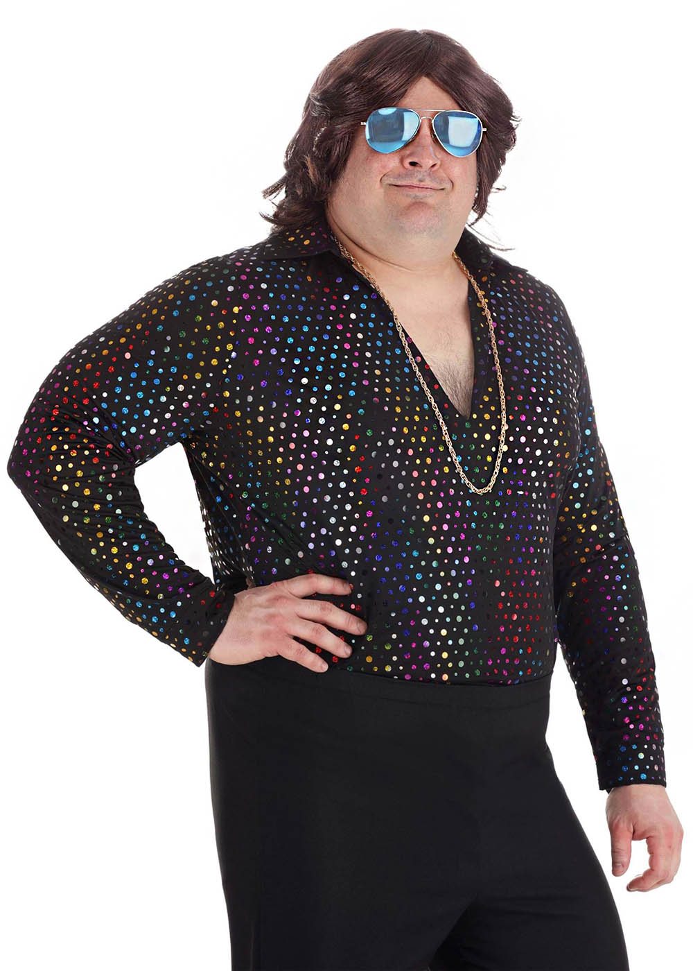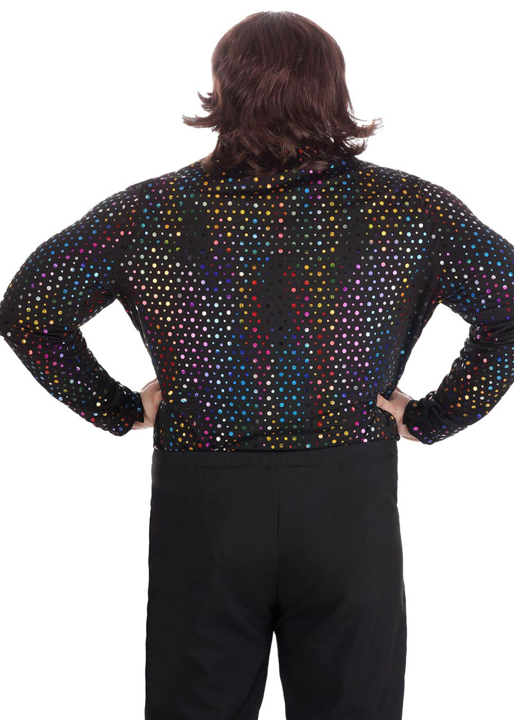 Эта мужская диско рубашка изготовлена из блестящей ткани с пайетками. Она имеет V-образный вырез. Застежка на липуче на манжетах рукавов обеспечивает удобную посадку.