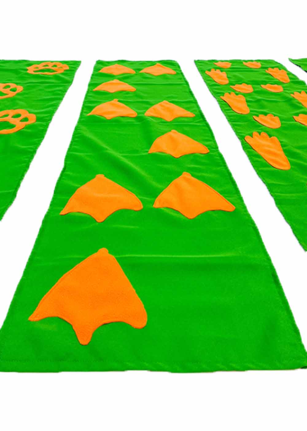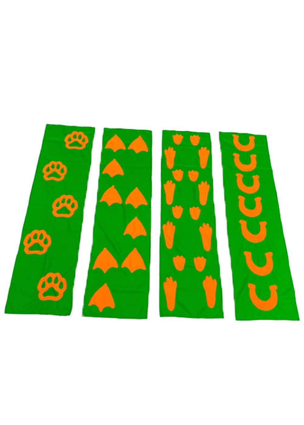 Реквизит Дорожка следы животных представляет собой четыре зеленые дорожки, украшенные оранжевыми следами животных. Каждая дорожка имеет длину 145 см и ширину 35 см, обеспечивая достаточное пространство для активных игр.