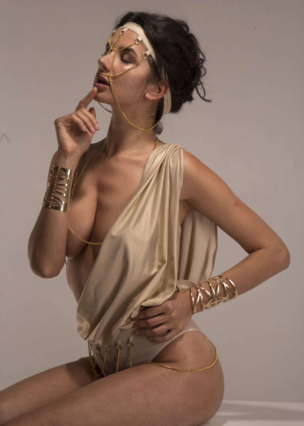 Представьте себя в роли соблазнительной Богини с этим эротическим костюмом, который сочетает в себе нежность и сексуальность. Комплект включает в себя элегантную накидку-пояс, трусики и повязку на голову из прекрасного шелка светло-бежевого оттенка, который кажется словно светится. Этот костюм обязательно покорит сердце вашего партнера и добавит неповторимого очарования вашему вечеру.