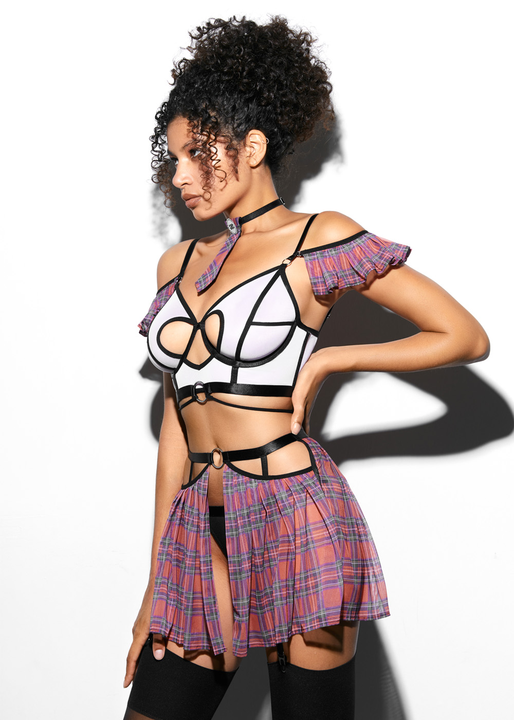 Костюм школьницы воплощает в себе искру, способную разжечь огонь. Созданный для того, чтобы помочь женщинам раскрыть в себе двойственность, он представляет собой эксклюзивный дизайн и использование лучших материалов для тех, кто ценит качество. В комплект входят бюстгальтер с заниженной талией, трусики с открытым входом, галстук и юбка с держателями для чулок. Принт шотландского тартана на ткани придает образу особый характер и делает его стильным и запоминающимся.