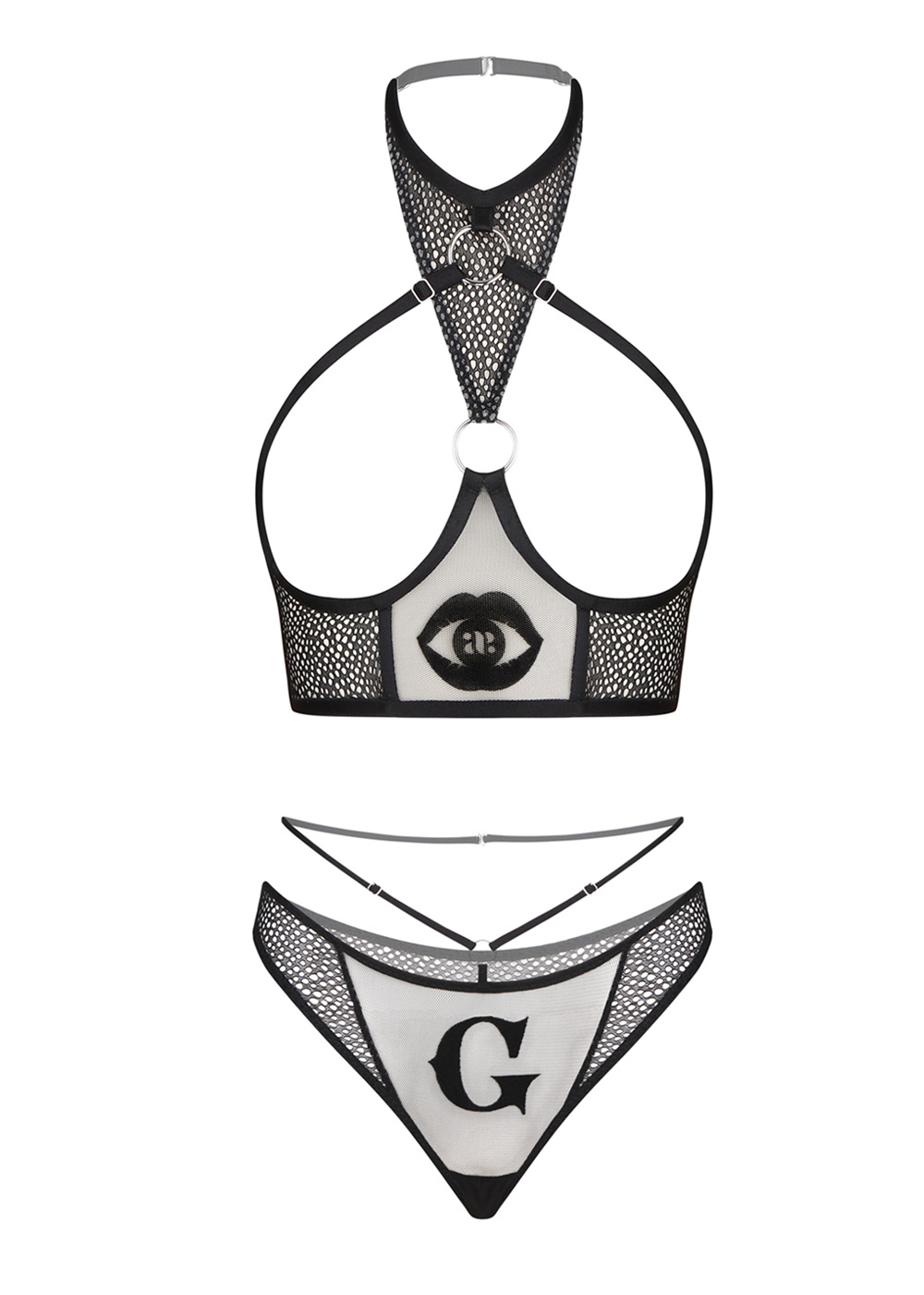 Этот провокационный комплект, изготовленный из шелка и стрейч-сетки, включает в себя бра без чашечек с тематической эмблемой масонского глаза и трусики со знаковой буквой "G". Эмблема масонского глаза добавляет таинственности и эротического загадочного шарма, в то время как буква "G" является символом тайны и власти. Сочетание этих символов создает уникальный дизайн, который подчеркнет вашу соблазнительность и привлекает внимание к вашей фигуре.