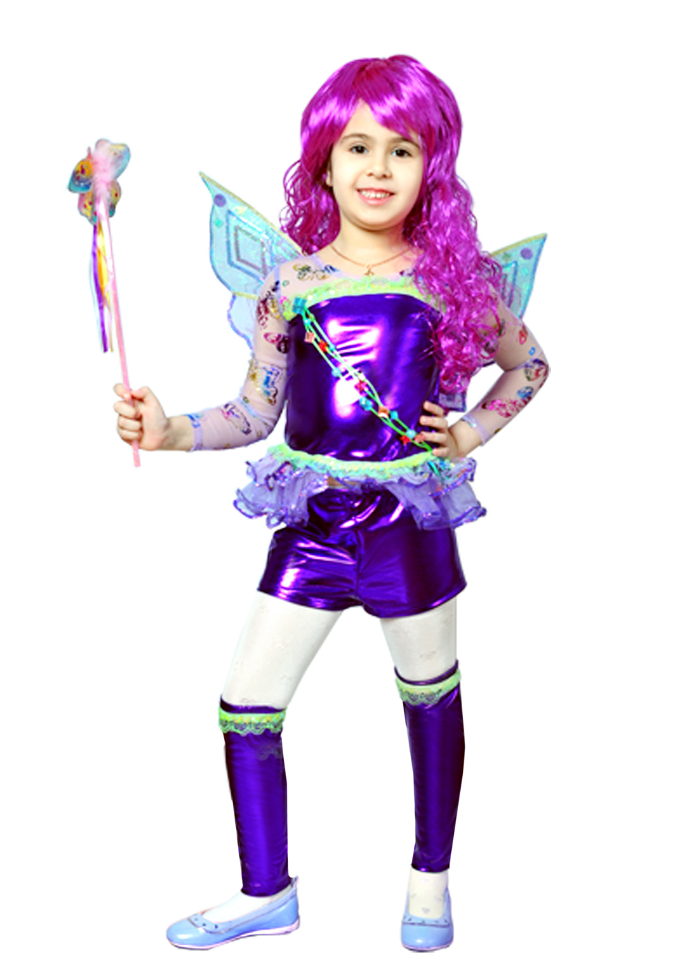 Костюм Фея Текна состоит из: комбинезона, гетр, парика. Рукава выполнены из фатина и декорированы узором. Пояс и линия ворота декорированы зеленой тесьмой. Шорты украшены рюшами. Гетры имеют зеленую вставку и украшение в виде зеленого кружева. Парик украшает и дополняет образ.