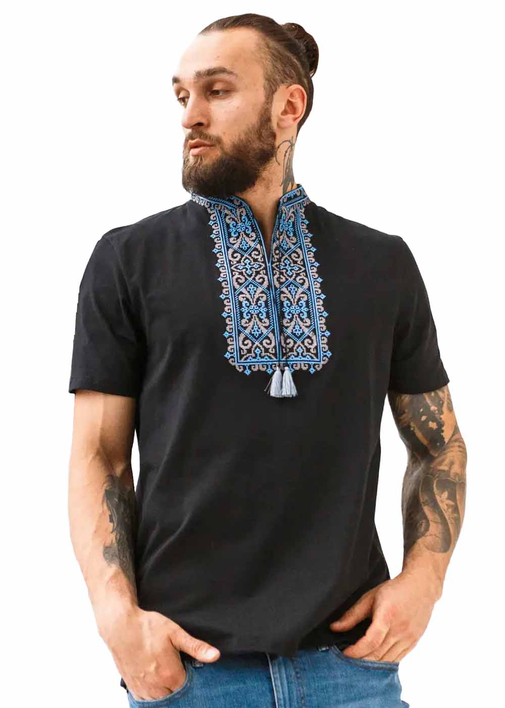 Футболка вышиванка Данило синяя продолжает коллекцию вышитой одежды. Мужская вышитая футболка выполнена из качественных материалов.
