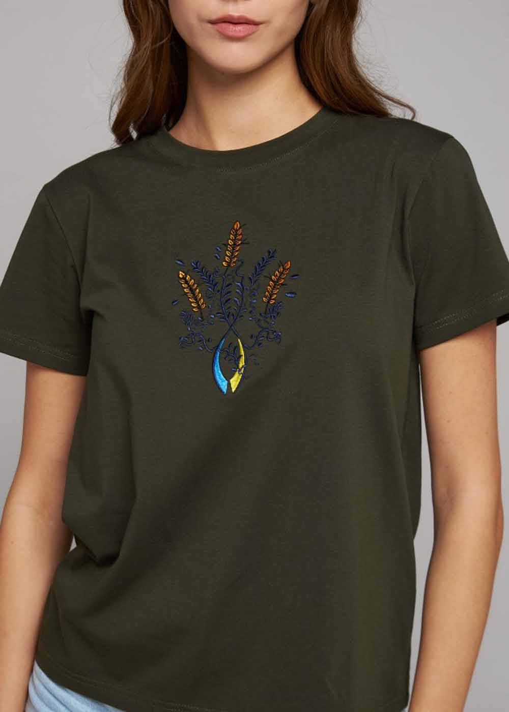 Женская футболка вышиванка украинская представлена цвета хаки и пошита из качественного хлопка и лайкры. Предлагается в нескольких размерах: S-M, L-XL. Декорирована спереди вышивкой в виде Герба Украины.