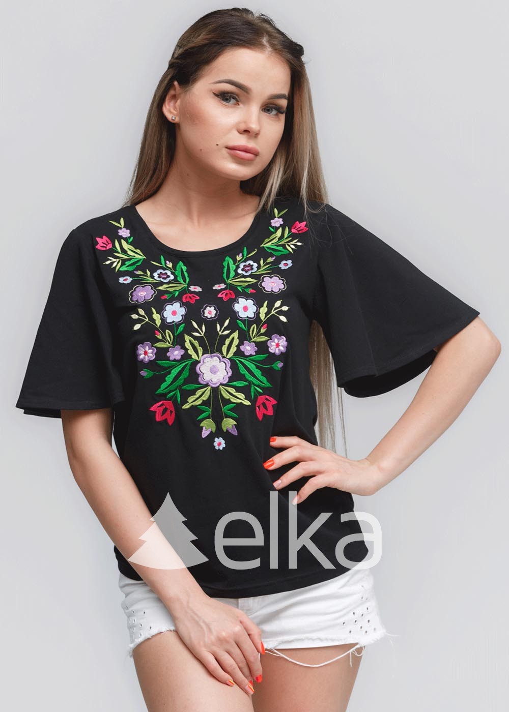 Основная ткань - трикотаж высокого качества. Особенность данной модели в ее оригинальной цветочной вышивке и широких рукавах. Изящные цветочные узоры символизирует благодать, энергию и любовь. Женщина будет излучать чрезвычайную силу и светлую энергию. Орнаменты вышиты в технике "гладь". Вышиванка с коротким рукавом подчеркивает женственность и хрупкость образа.