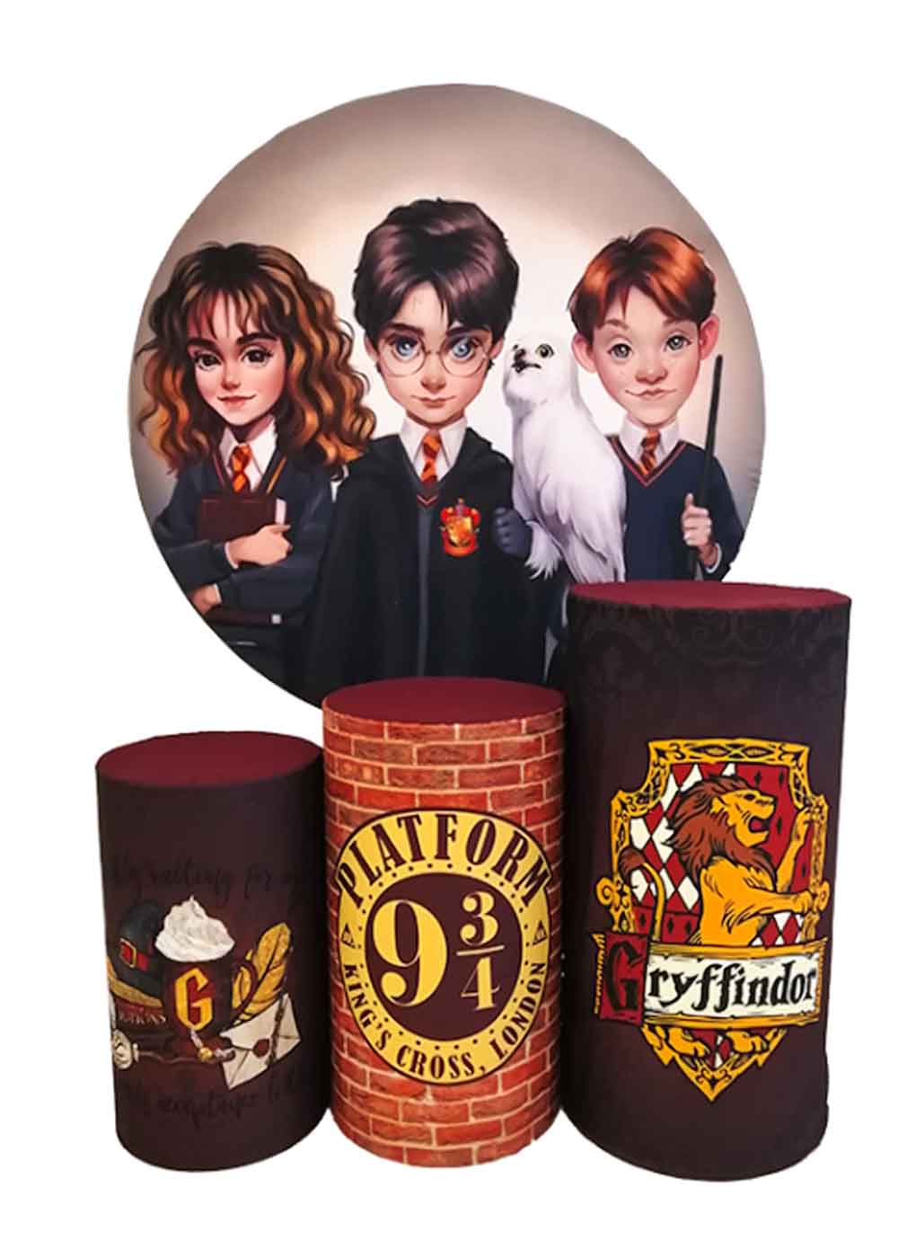 Фотозона Гарри Поттер погружает участников в магический мир известной книжной и кинематографической серии о юном волшебнике. Комплектация включает следующее: чехол на круг габардин, полноцветная печать , этот чехол представляет собой круглую ткань с полноцветным изображением, отражающим атмосферу волшебного мира Гарри Поттера. На нем могут быть изображены главные герои, волшебные артефакты, а также другие элементы, характерные для Гарри Поттера. Три чехла на тумбы габардин печать, эти чехлы предназначены для облицовки тумб, которые служат опорой для круглой ткани. Они также могут быть украшены изображениями, соответствующими тематике.Основы для фотозон приобретаются отдельно.