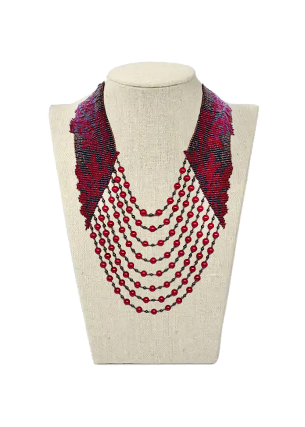 Гердан Багровый представляет собой изысканное украшение, в котором красные бусины первыми привлекают внимание. Нити ожерелья умело соединяют два полотна с изображением багровых листьев, создавая уникальный орнамент. Красный бисер в сочетании с радужным придает ожерелью разнообразие цветов. Украшение имеет длину 38 см и ширину 12 см. Изготовлено из высококачественного чешского бисера и стеклянных бусин, гарантируя долговечность и привлекательный внешний вид.