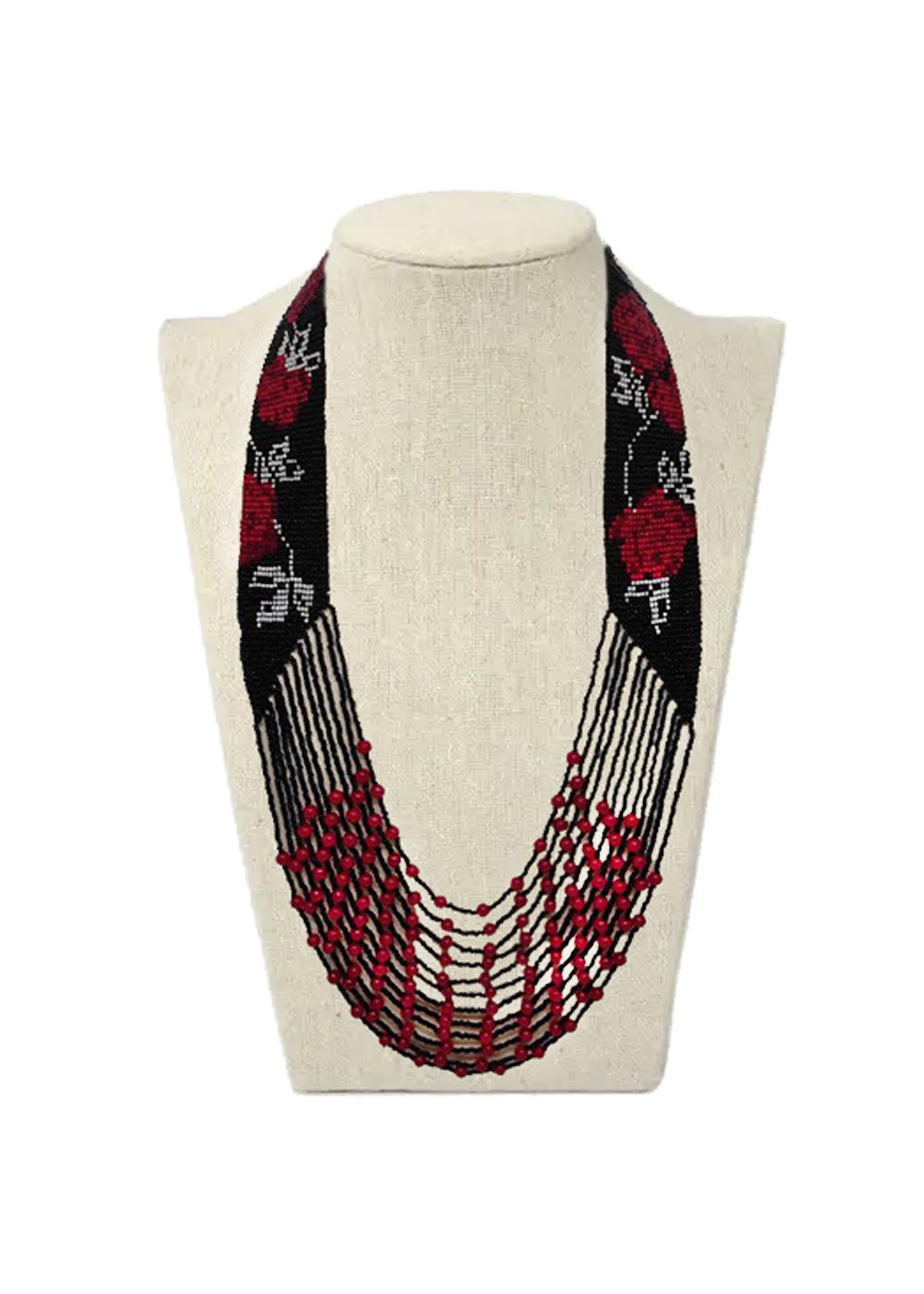 Гердан Розали в черно красной гамме и с изображением розы – это истинное произведение искусства.Классическая цветовая комбинация черного и красного позволяет легко сочетать этот гердан с различными нарядами, включая вышиванки. На этом ожерелье вы найдете красную розу, выполненную из красного бисера, которая стоит на фоне черного бисера, создавая эффектный контраст. Вместо острых шипов, роза украшена контрастными серебряными листочками, придающими ей особую изящность. Этот гердан, имеет длину 46 см и ширину 7 см. Изготовленный из качественного чешского бисера и бусин.