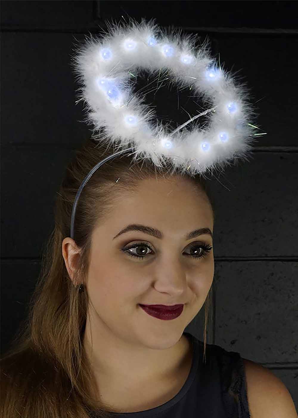 Головной убор Ангела, это идеальное дополнение к вашему образу ангела. Повязка на голову из пластика с прикрепленным белым ореолом из перьев создает нежный и воздушный вид. Размер нимба составляет 21 см, что обеспечивает эффектное и впечатляющее визуальное присутствие. Светящиеся светодиоды внутри ореола добавляют магии и загадочности вашему образу, подчеркивая вашу духовность и светлость.