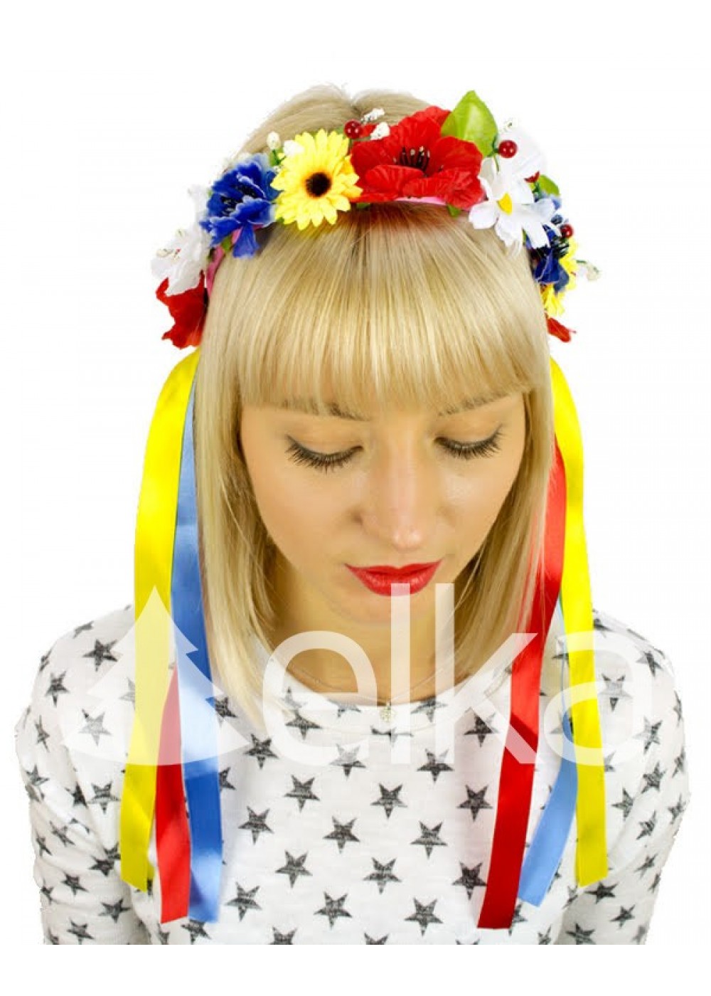 Основные цвета - желтый, красный, синий. Состоит венок из каркаса и украшений. В комплект идет головной убор. Розовый обруч декорирован разными видами цветов. Сбоку декорации в виде ярких атласных лент средней длинны. Венок украинский, как часть народного образа, подойдёт для любого праздничного мероприятия.