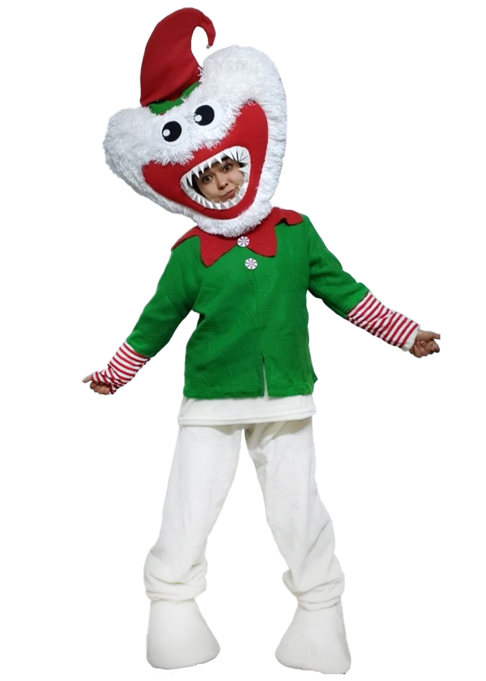 Ростовой костюм Хаги Ваги Новогодний принесет в ваш праздник волшебство и веселье! В комплекте: головной убор, комбинезон и имитация обуви. Изготовлен из качественного текстиля, обеспечивающего комфорт и свободу движений. Яркие цвета - белый, зеленый и красный, придают костюму праздничный вид и создают атмосферу веселья.