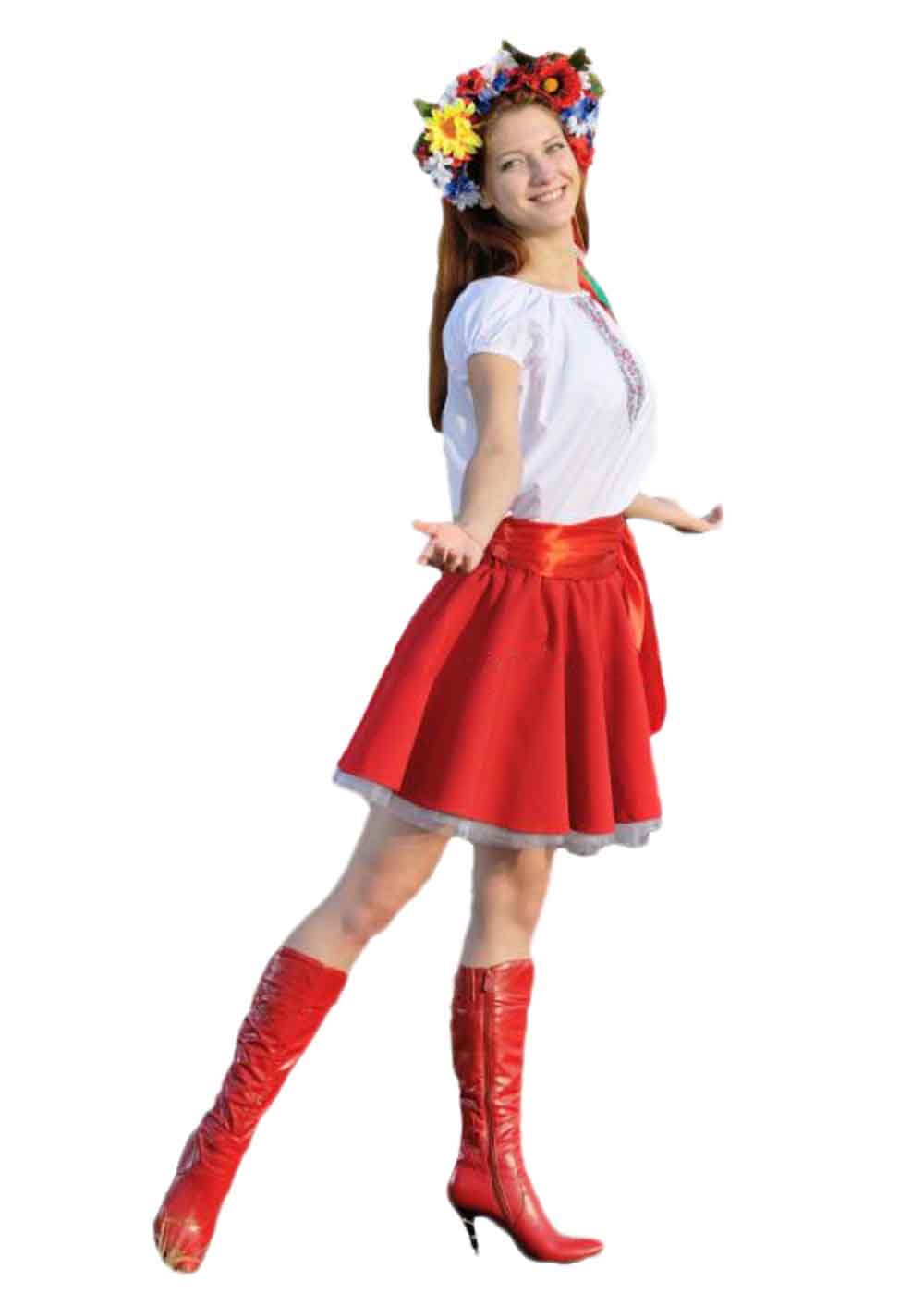 Карнавальный костюм Украиночки выполнен из габардина, шифона, рубашечной ткани и атласа. В комплект входят блуза, юбка, подъюбник и пояс. Белая блуза с вышивкой гармонично сочетается с ярко-красной юбкой, создавая образ яркой и жизнерадостной украинской девушки. Атласный пояс подчеркивает талию, добавляя наряду изысканности и элегантности.