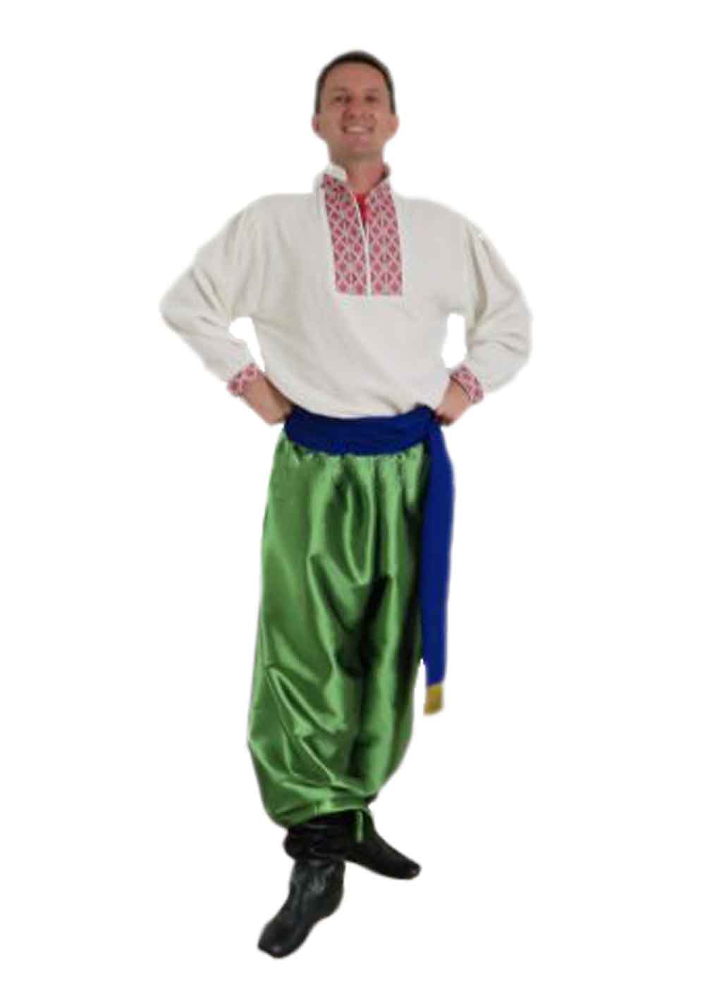 Классический украинский костюм включает в себя рубашку, шаровары и пояс, и представляет собой традиционный наряд украинского мужчины. Вышитая рубашка из коттона украшена геометрическим орнаментом в красных и белых тонах, подчеркивая исторические корни костюма. Широкие шаровары из атласа зеленого цвета обеспечивают комфорт и свободу движений, а пояс синего цвета завершает образ, добавляя яркости и стиля. Такой костюм идеально подходит для народных праздников, исторических реконструкций и культурных мероприятий. Украинские мужские сапоги можно приобрести дополнительно для полного завершения образа.