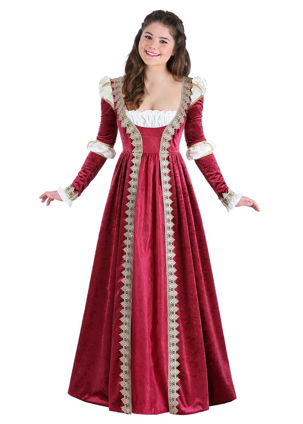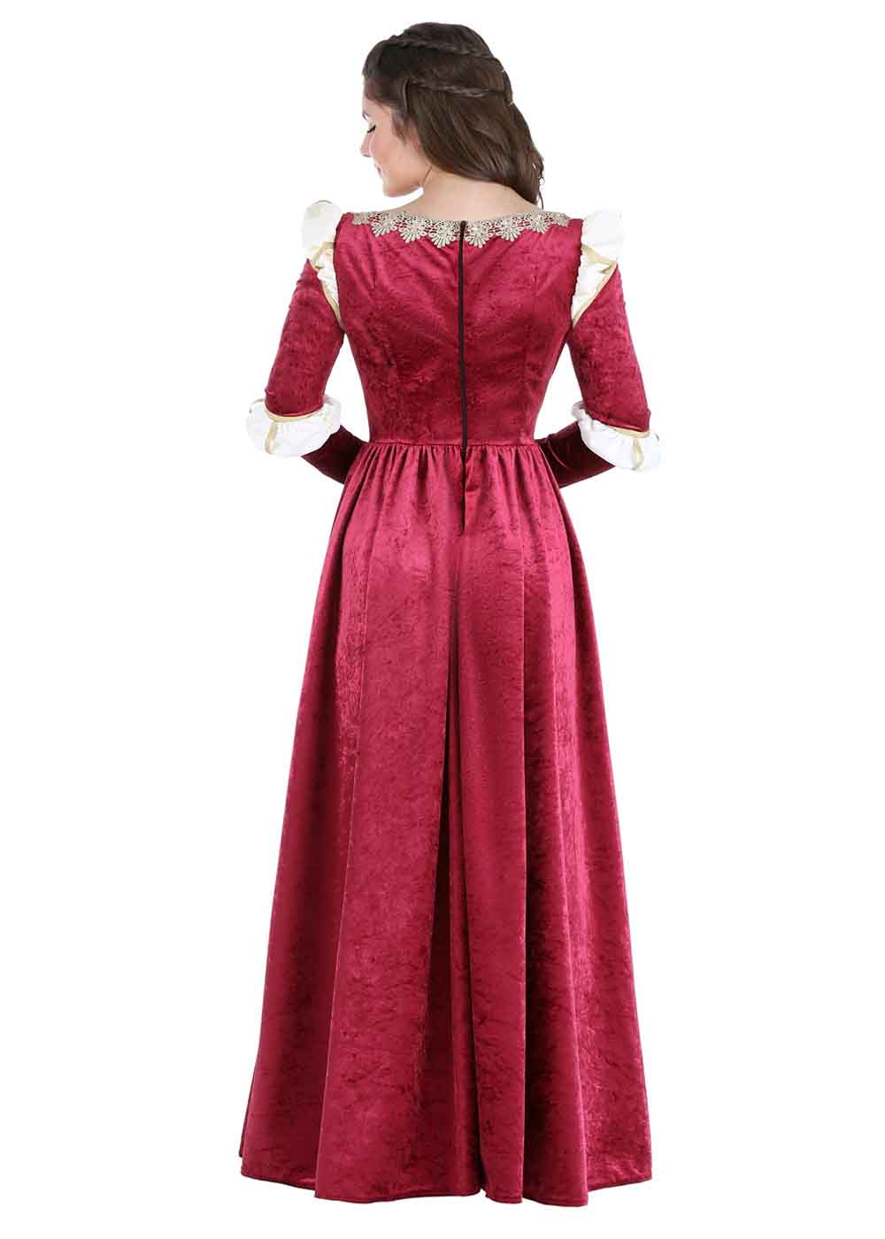 Почувствуйте себя настоящей дивой в этом роскошном костюме! Платье из бархата и парчи застегивается на молнию сзади и имитирует многослойный наряд с сорочкой, нижней юбкой и верхним платьем. Кремовые вставки выглядят как сорочка, выглядывающая через декоративные разрезы. Передняя парчовая вставка напоминает нижнюю юбку, а темно-красное верхнее платье украшено золотым кружевом и тесьмой, придавая образу элегантность и изящество.