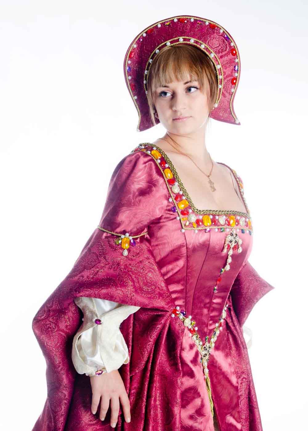 Костюм Анны Болейн сшит из высококачественного материала, создавая аристократичный и элегантный образ. Комплект состоит из платья, головного убора и кринолина. Платье роскошного розового цвета украшено тесьмой, бусинами и камнями, придавая наряду великолепие и изысканность. Двойные рукава добавляют очарование и изящество. Нижняя часть юбки белого цвета вшита к основной юбке, а разрез спереди создает эффект двойной юбки, добавляя глубину и объем. Завершает образ изящный головной убор, подчеркивающий статус и стиль Анны Болейн. Этот костюм идеально подойдет для исторических реконструкций, театральных постановок и торжественных мероприятий, привнося атмосферу прошлого в настоящее.