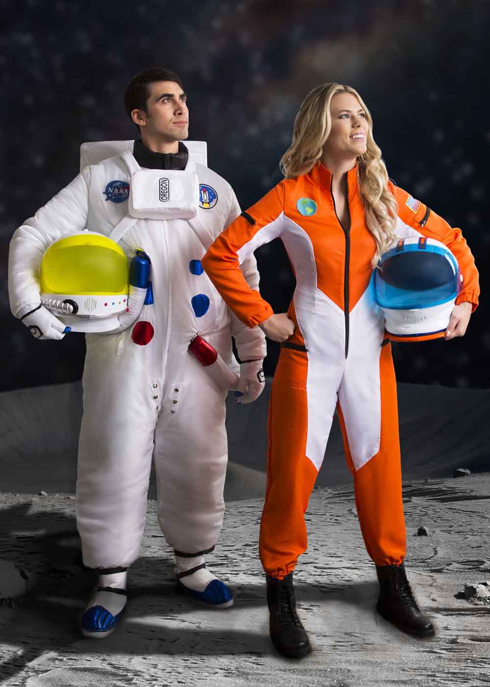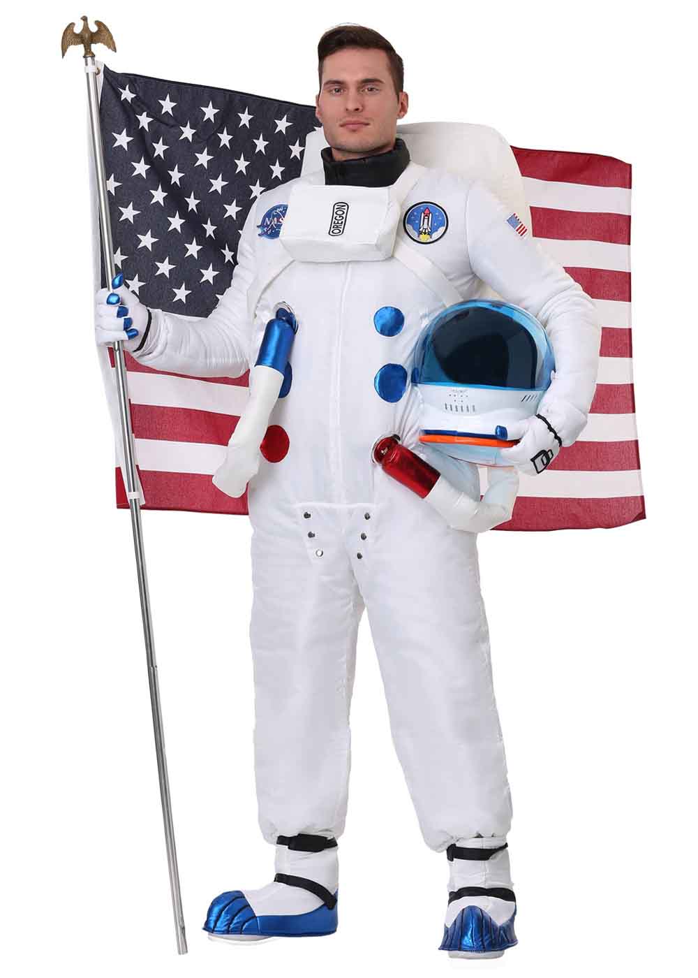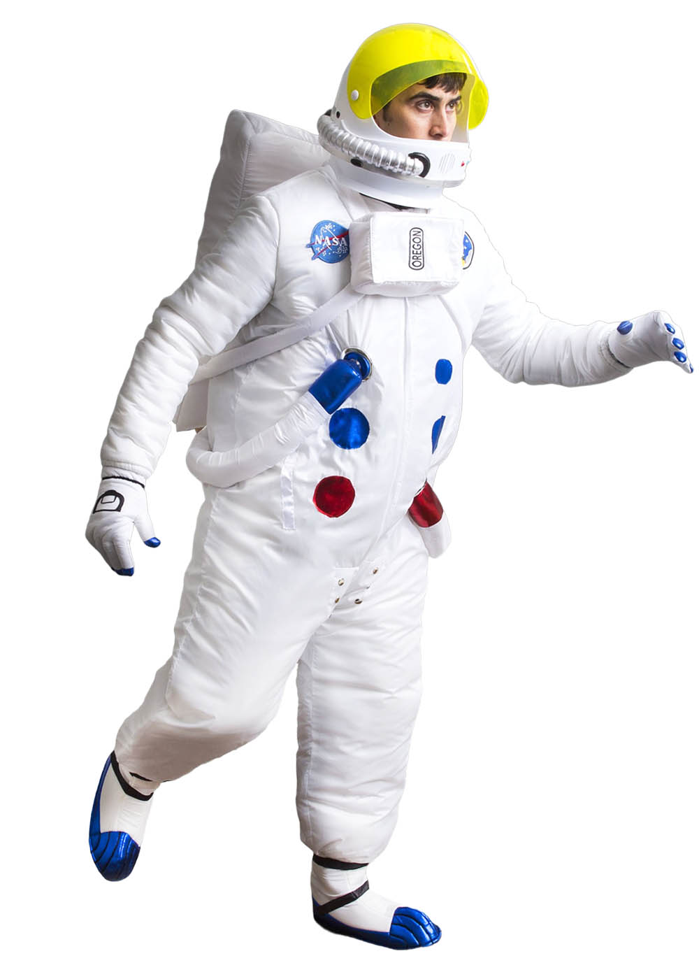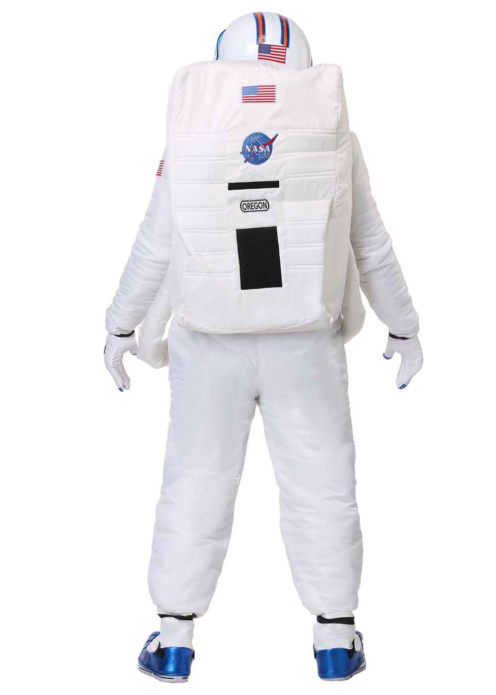 Костюм астронавта имеет переднюю молнию для удобства надевания. Наполненные волокном шланги крепятся к комбинезону с помощью металлических кнопок. Ремни рюкзака соединяются с помощью липучки. Накладки на ботинки имеют эластичные ленты для фиксации под ногами. Перчатки с эластичной лентой на запястьях. Много вышитых нашивок.