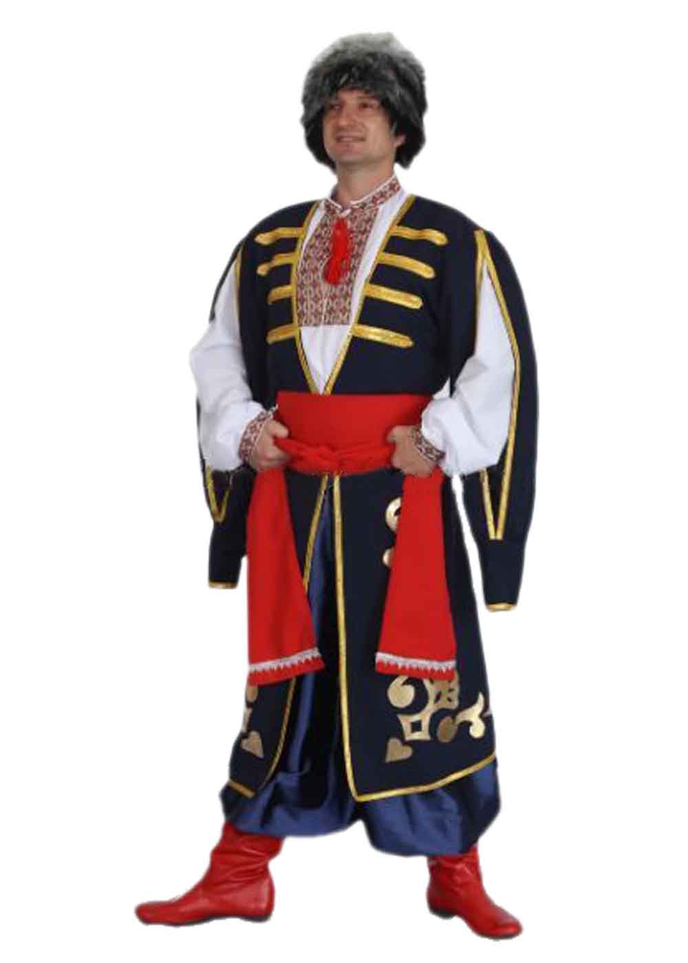 Костюм Атамана Запорожского представляет собой традиционный мужской наряд, включающий рубашку, шаровары, пояс, головной убор, жилет и свитку. Вышитая рубашка выполнена из коттона и украшена традиционным украинским орнаментом. Шаровары из атласа отличаются ярким синим цветом и удобством в носке. Жилет и свитка из габардина декорированы золотыми аппликациями и дополнены красным поясом, создавая эффектный и аутентичный образ. Головной убор из искусственного меха завершает комплект, подчеркивая статус и значимость атамана. Костюм идеально подходит для театральных постановок, фольклорных мероприятий и исторических реконструкций. Все элементы костюма шьются на заказ по индивидуальным меркам. Дополнительно можно приобрести сапоги и другие аксессуары.