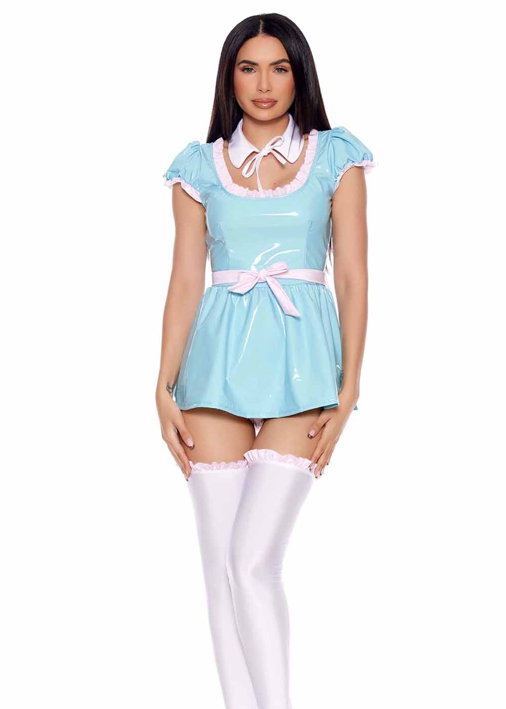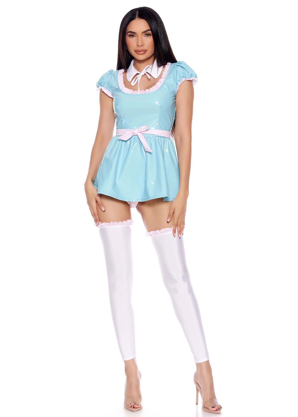 Костюм близнецов Грейди излучает игривый шик и стиль. Платье из блестящей кожи застегивается молнией по центру спинки, с эластичными оборками на рукавах и воротнике. Эластичный воротник завязывается вокруг шеи с розовыми завязками, добавляя нотку нежности. Трусики эластичные с резинкой на штанинах обеспечивают комфортную посадку. Розовый пояс завязывается по желанию вокруг талии, подчеркивая фигуру. Белые чулки с оборками по верху завершают уникальный и стильный образ.