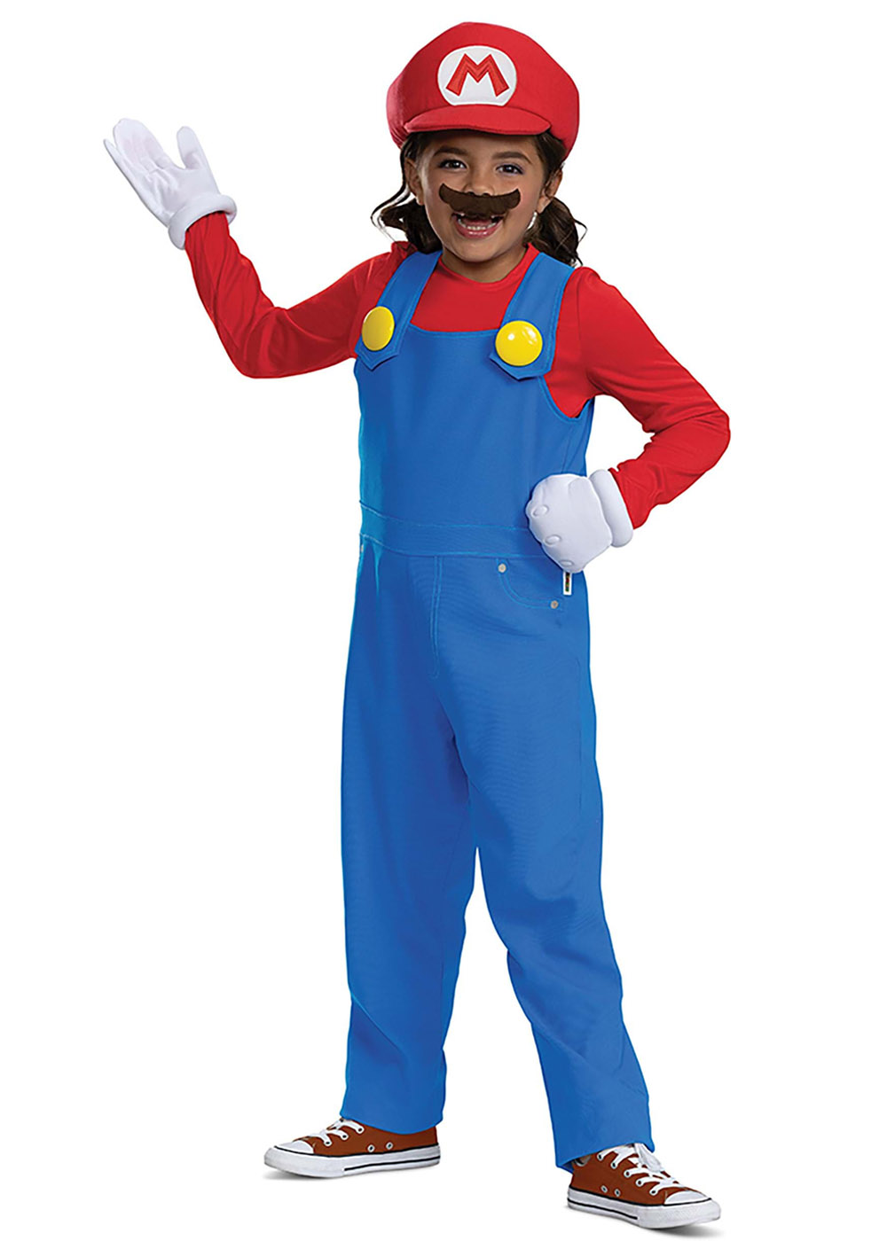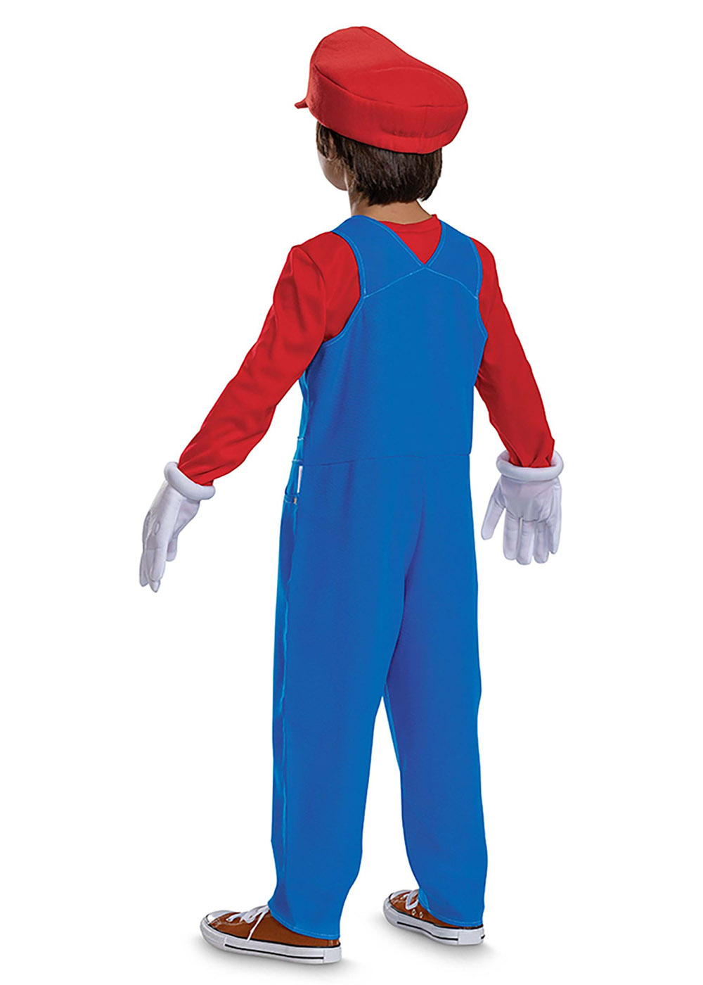 Детский костюм брата Марио выполнен из трикотажной. Включает в себя кофту с круглым вырезом и комбинезон со штанами, сзади на липучках под декоративными пуговицами. В комплект также входят шляпа с нашивкой, и самоклеющийся усы с клеевой основой. Костюм также включает в себя перчатки.