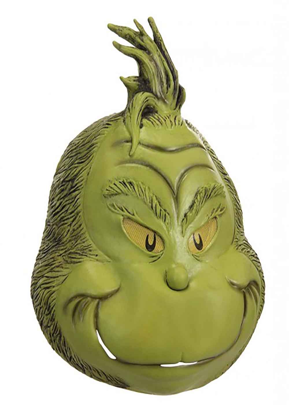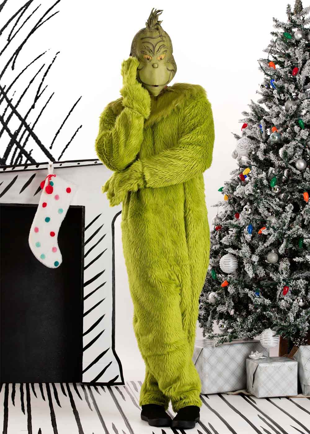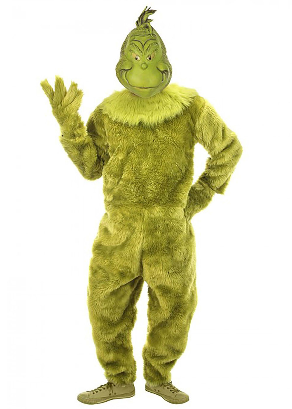 Костюм Гринча с маской изготовлен из искусственного меха. Комбинезон имеет липучку по центру спины для удобства надевания. Воротник с тканевыми завязки сзади. Маска покрывает все лицо и верх головы. Сетчатые отверстия для глаз обеспечивают хороший обзор.