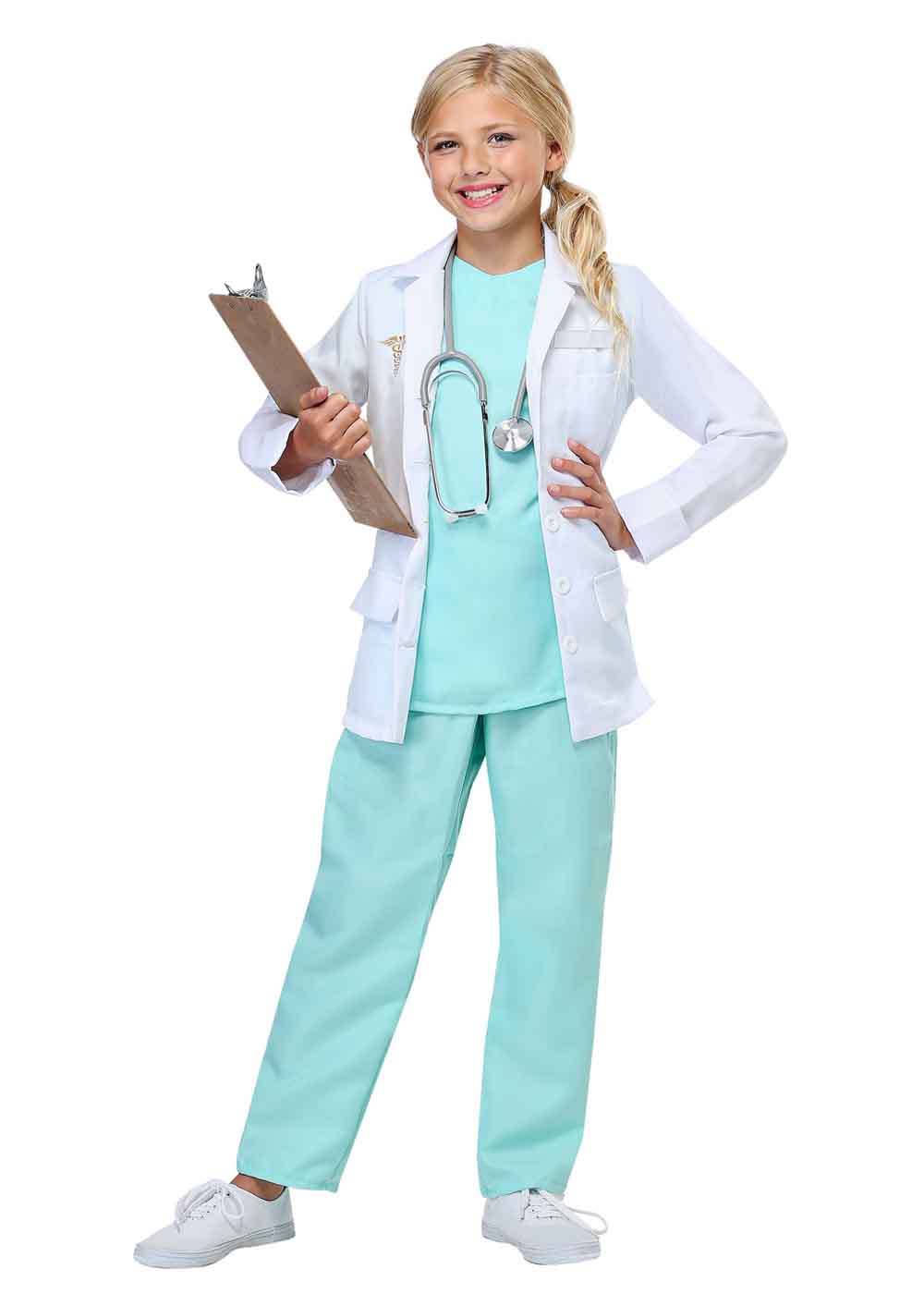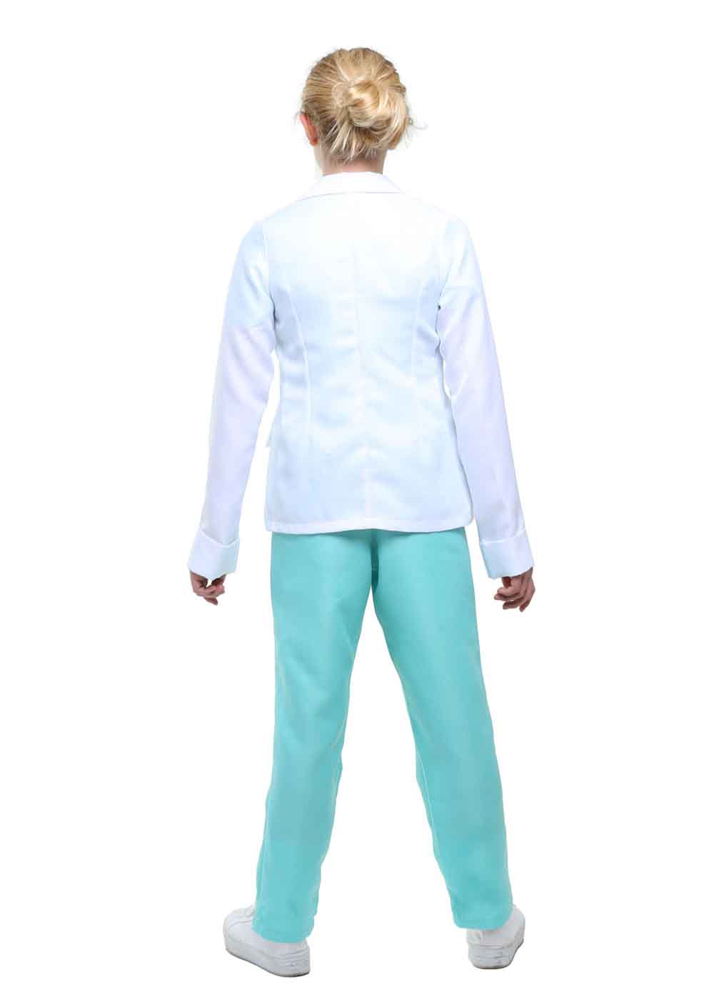 Костюм доктора для девочки включает кофту с пуговицей на спине, брюки с эластичным поясом и лабораторный халат с функциональными карманами.