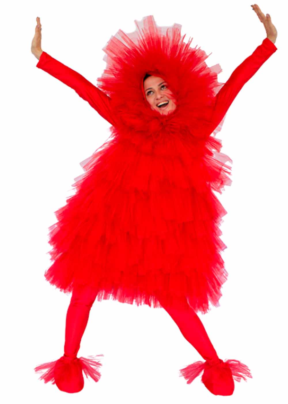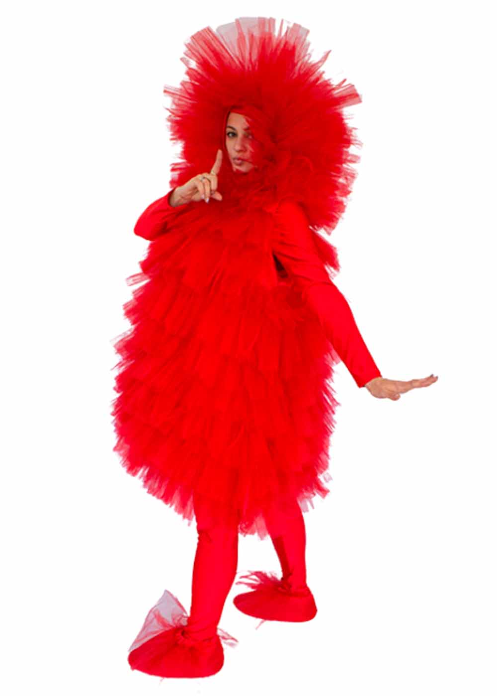 Костюм карнавальный Фьека в ярко-красной расцветке представляет собой эффектное сочетание стиля. В комплект входят красная блуза с капюшоном, придающая образу загадочности, а также платье и лосины для создания полного и стильного образа. Имитация обуви дополняет костюм, придавая ему завершенный вид.