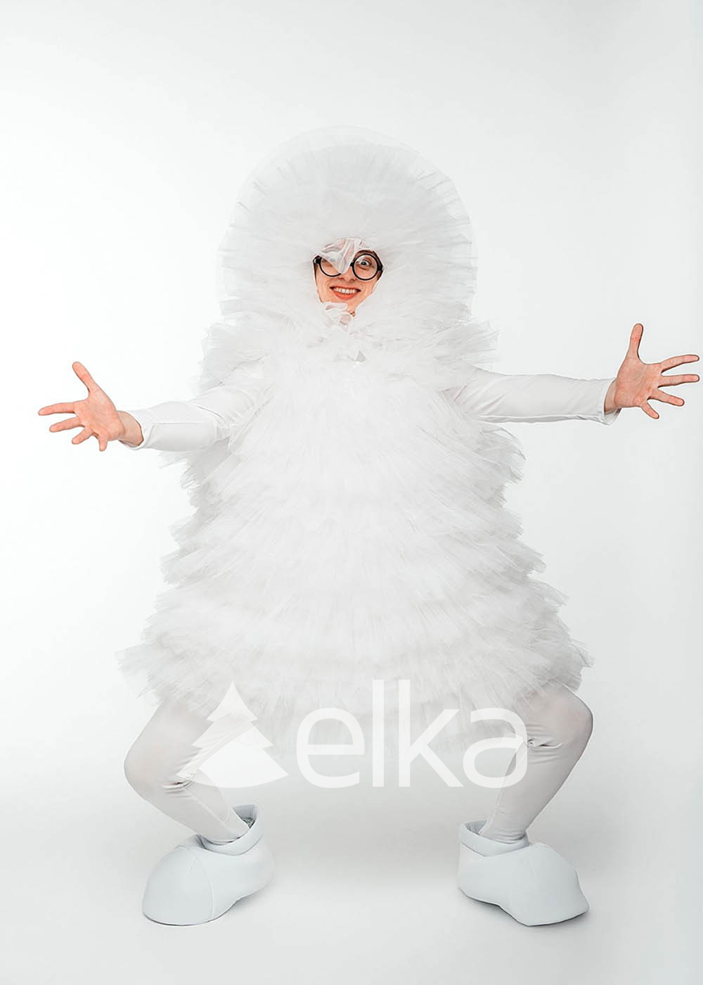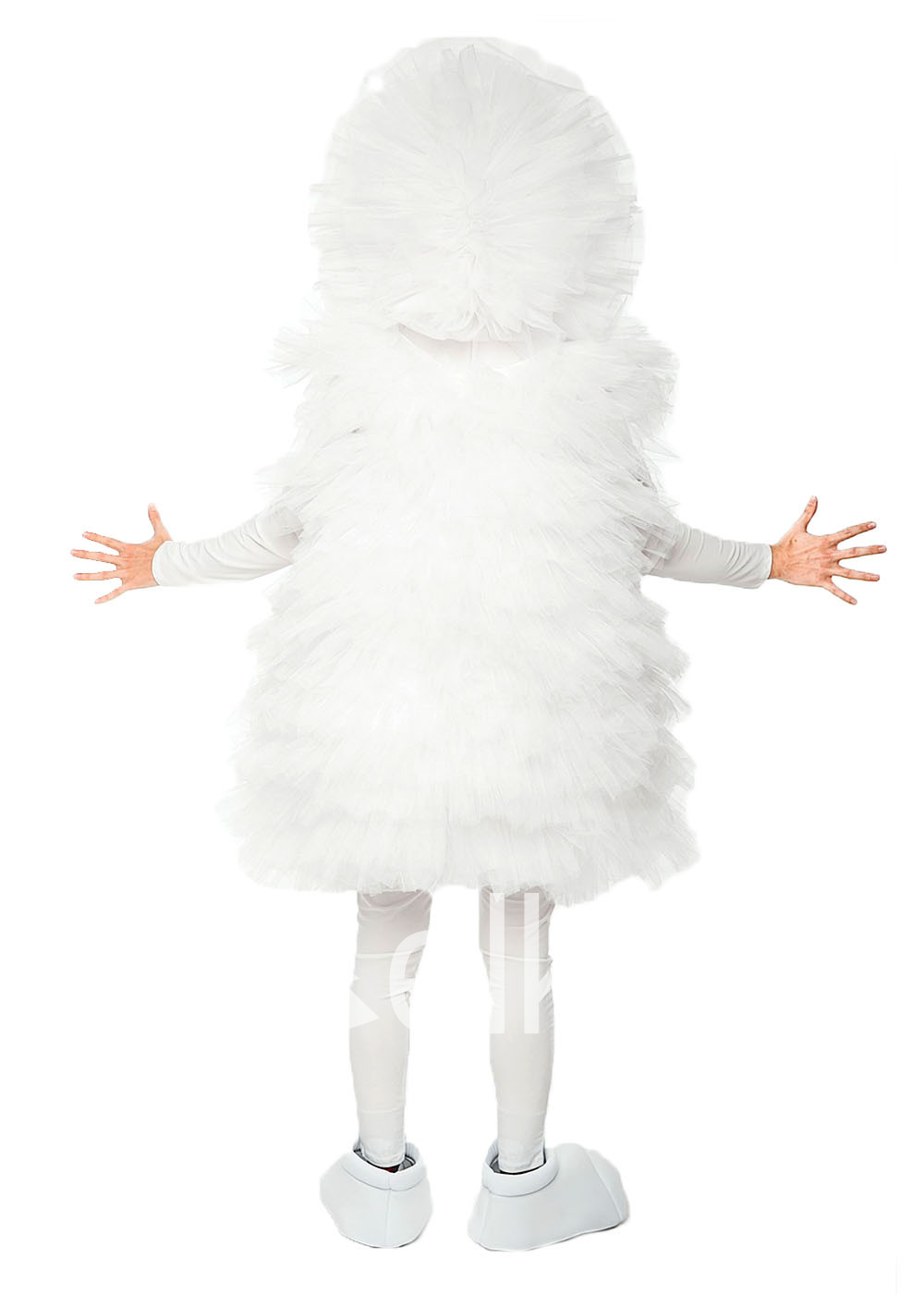 Костюм Фьека белый выполнен из качественного атласа, трикотажа, фатина и поролона. Укомплектован наряд блузой с капюшоном, гетрами и имитацией обуви. Эластичная блуза с капюшоном имеет длинные рукава и фронтальную застежку-молнию. Сверху надевается пышное платье из фатиновых оборок. Белоснежные гетры и мягкие ботинки являются завершающими элементами наряда сказочного персонажа.