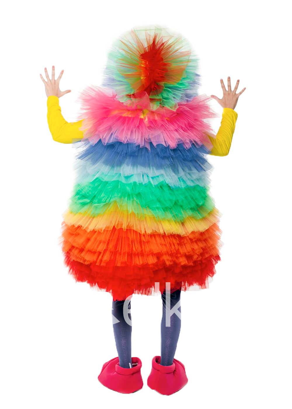 Костюм Фьека разноцветный выполнен из высококачественного трикотажа, разноцветного фатина, атласа и поролона. В комплект входит блуза с капюшоном, платье, гетры и имитация обуви. Костюм подходит как мужчинам, так и женщинам. Нижняя часть наряда — блуза с капюшоном, украшенным пышными оборками из фатина. Сверху надевается объемное платье радужного цвета, а гетры и мягкие бахилы, имитирующие обувь сказочного героя, завершают образ Фьека.