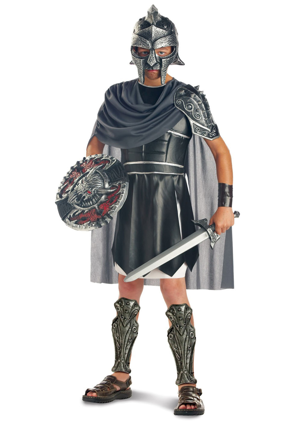 Детский костюм Гладиатора превращает вашего ребенка в непобедимого воина арены. Он включает в себя броню из искусственной кожи, серый плащ, литые наколенники, накладки на плечи и шлем. Этот костюм подойдет для костюмированных вечеринок и хэллоуинских празднований, добавляя аутентичности и воинственного вида вашему маленькому гладиатору.