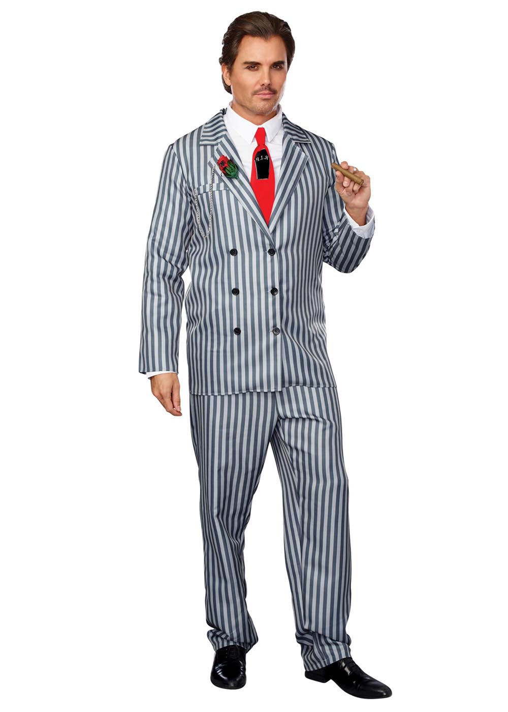 Костюм Гомеса изготовлен из полиэстера. Пиджак из полосатой ткани с застежкой на две ряда пуговиц спереди. На левом нагрудном кармане красная роза с деталями из серебра. Красный галстук с рисунком гроба с эластичной лентой на шее.