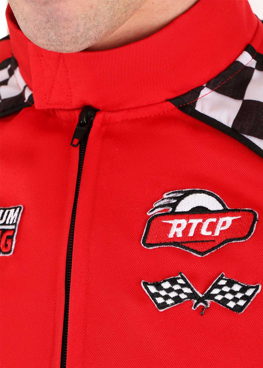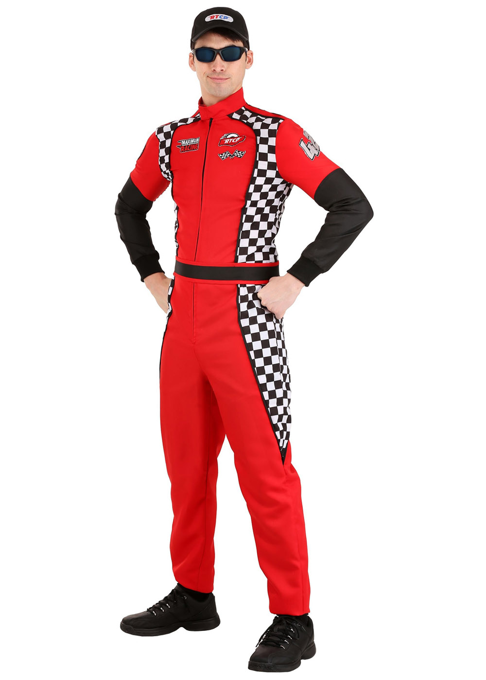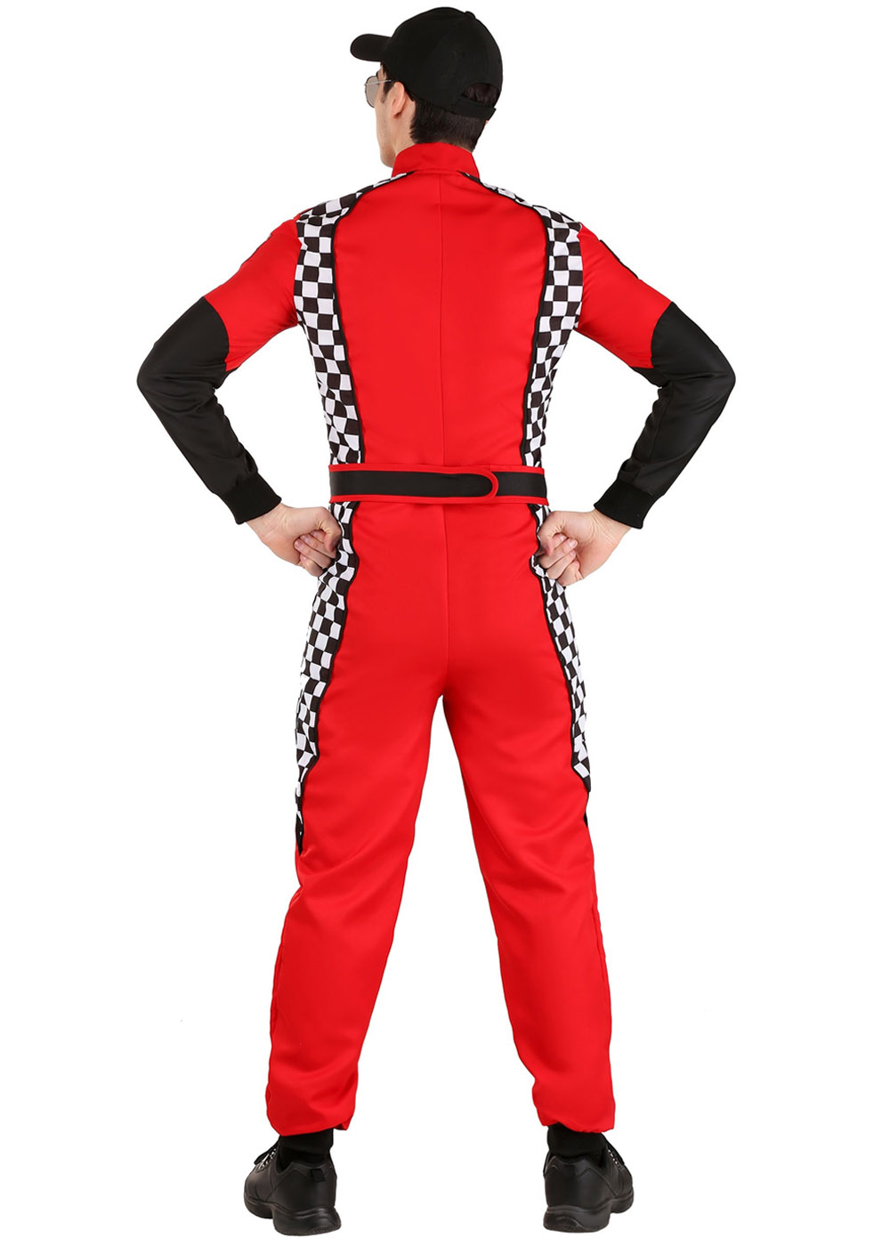 Костюм гонщика выполнен из полиэстера, включает комбинезон с передней молнией и липучкой. Манжеты на запястьях и ногах выполнены вставками в виде шахматной доски, обрамленными черным кантом. Комплект дополняется ремнем с липучкой на задней стороне, а кепка имеет регулируемый размер с помощью липучки.