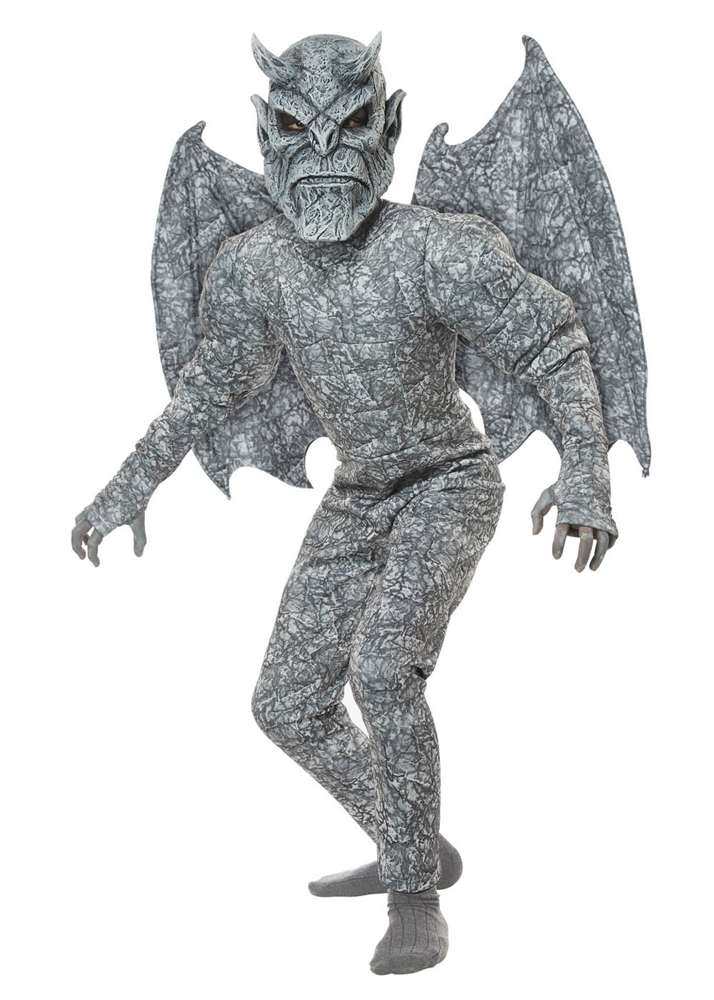 Костюм Горгульи для мальчика включает в себя комбинезон с липучкой по центру спины. Мягкие наполнители в груди и на плечах создают мускулистый вид. Весь костюм украшен принтом искусственного камня. Капюшон выполнен в стиле балаклавы из ткани. Виниловая маска имеет эластичную резинку вокруг головы. Крылья имеют проволочные каркасы для формы и эластичные плечевые ремни.