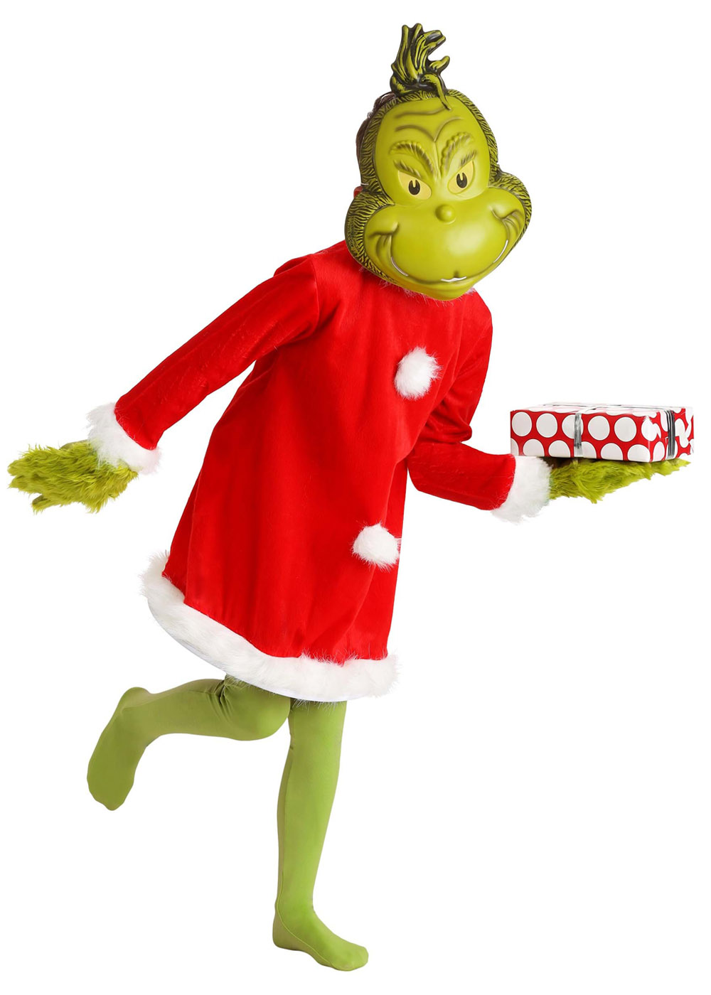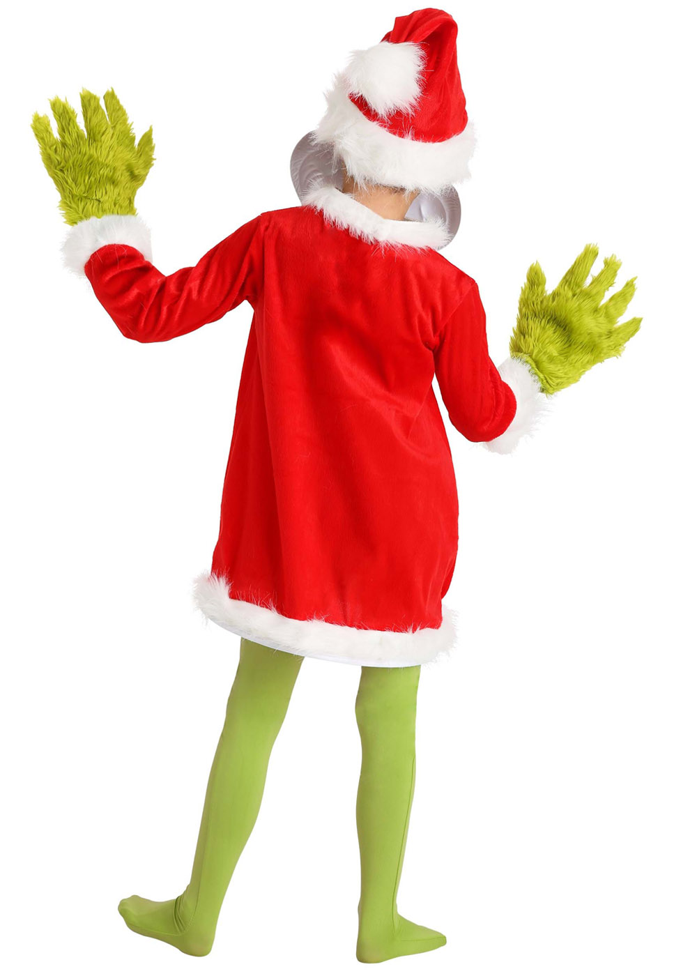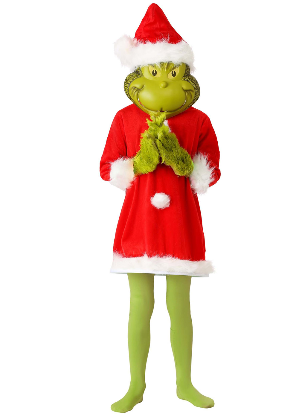 Костюм Гринча с маской выполнен из мягкого велюра и искусственного меха. На воротнике, манжетах кофты имеется отделка из белого меха. Литая пластиковая маска имеет эластичную ленту вокруг головы, а сетчатые отверстия для глаз обеспечивают хороший обзор.